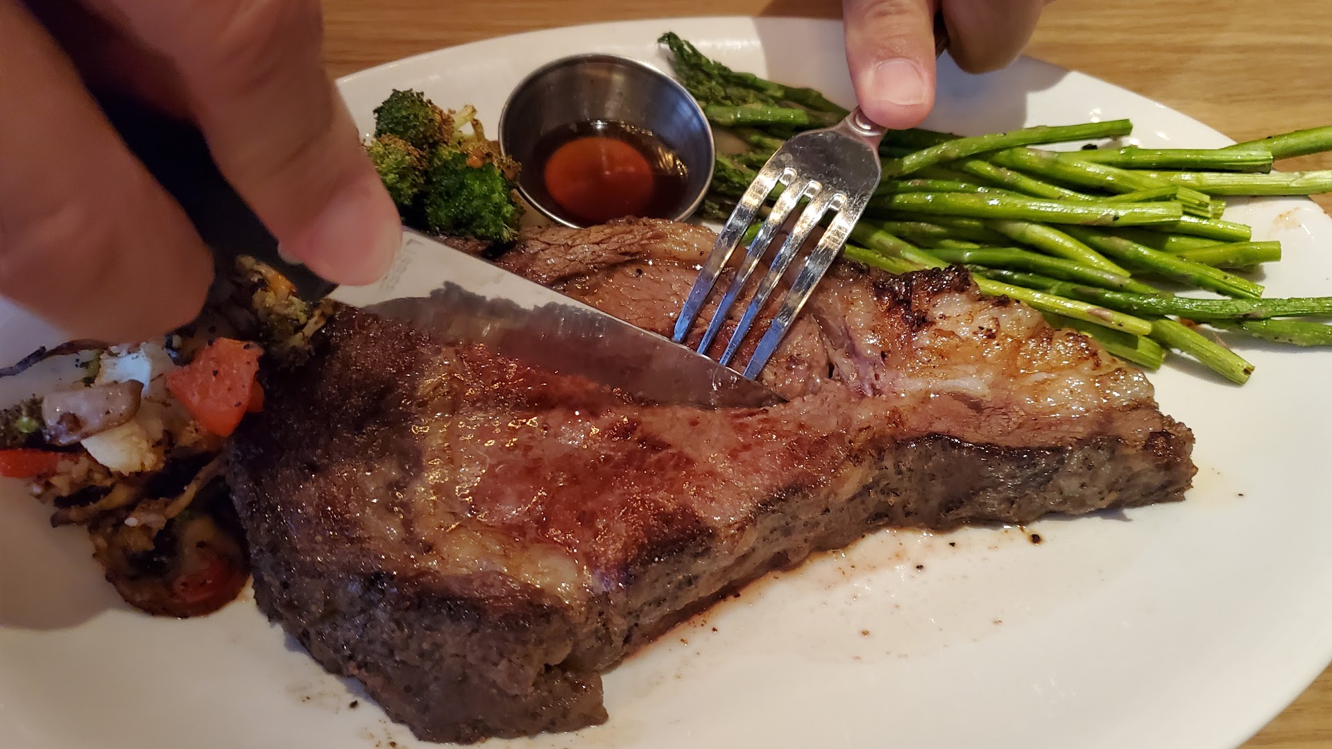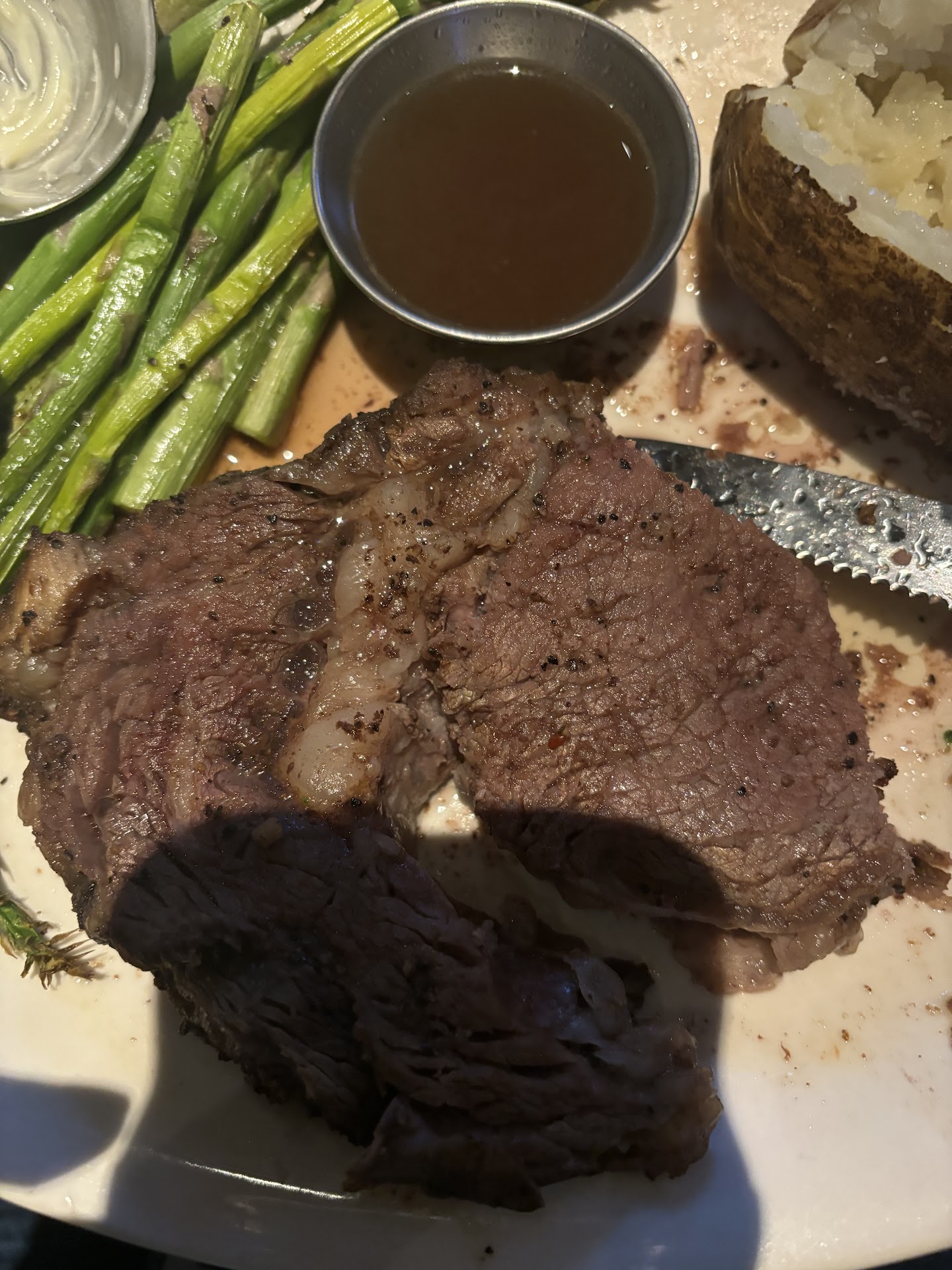 This evening I had an absolutely terrible experience at BJâs. My children and I were told 50-60 minutes via text and waited about 75 minutes. No biggie there. We got seated and it was obviously super crowded. It was super loud so I didnât catch the name of our waitress (lucky for her). Anyways, she couldnât hear my kids drink orders and assumed what they wanted. I had to raise my voice to ensure that she got my son the correct drink as well as my water with lemon. Mozzarella sticks came out fast and cold. I let that go because the kids were happy. I ordered the prime rib special at MEDIUM. Our waitress clearly didnât hear me because it came out burnt (photos). When it arrived, I had to wait for her to come over because she didnât deliver our food and hadnât been back to our table since we ordered. I asked what temperature she put my steak at and she didnât know. She asked me to cut it and I told her I didnât want to cut it to check it because it was clearly over medium. I didnât want it to be cut if it was sent back. It was well done (medium well at best). She then asked if I wanted them to cook it more and I explained that I like my steak âpinkâ. She asked if I wanted another one and I told her that this is why I didnât want to cut into it in the first place. She then asked if I wanted a free pizookie instead. I accepted the extra pizookie as I have 2 kids, however, it still doesnât change the issue at hand. She didnât know what temperature I said when ordering because she didnât hear me and she thought I wanted it cooked longer when it was clearly burnt already. She avoided our table after that. My kids needed more drinks and cheese for their pasta but I couldnât ask her as she was âtoo busyâ to stop at our table. We watched the manager ask every other table about their experiences except ours as well. When she finally asked if we were ready for dessert it took another 20 minutes for us to get it and the guy had been told we were celebrating a birthday. We politely declined the candle. She dropped the check 10 minutes after that and didnât ask if there was anything else we needed. I had to ask the bartender for waters for my kids. My children were both appalled by the service and my son, who asked to come there, asked to never come back again because the people were âso rudeâ. Sad and disappointed. The first picture is my steak and the second shows whatâs advertised....