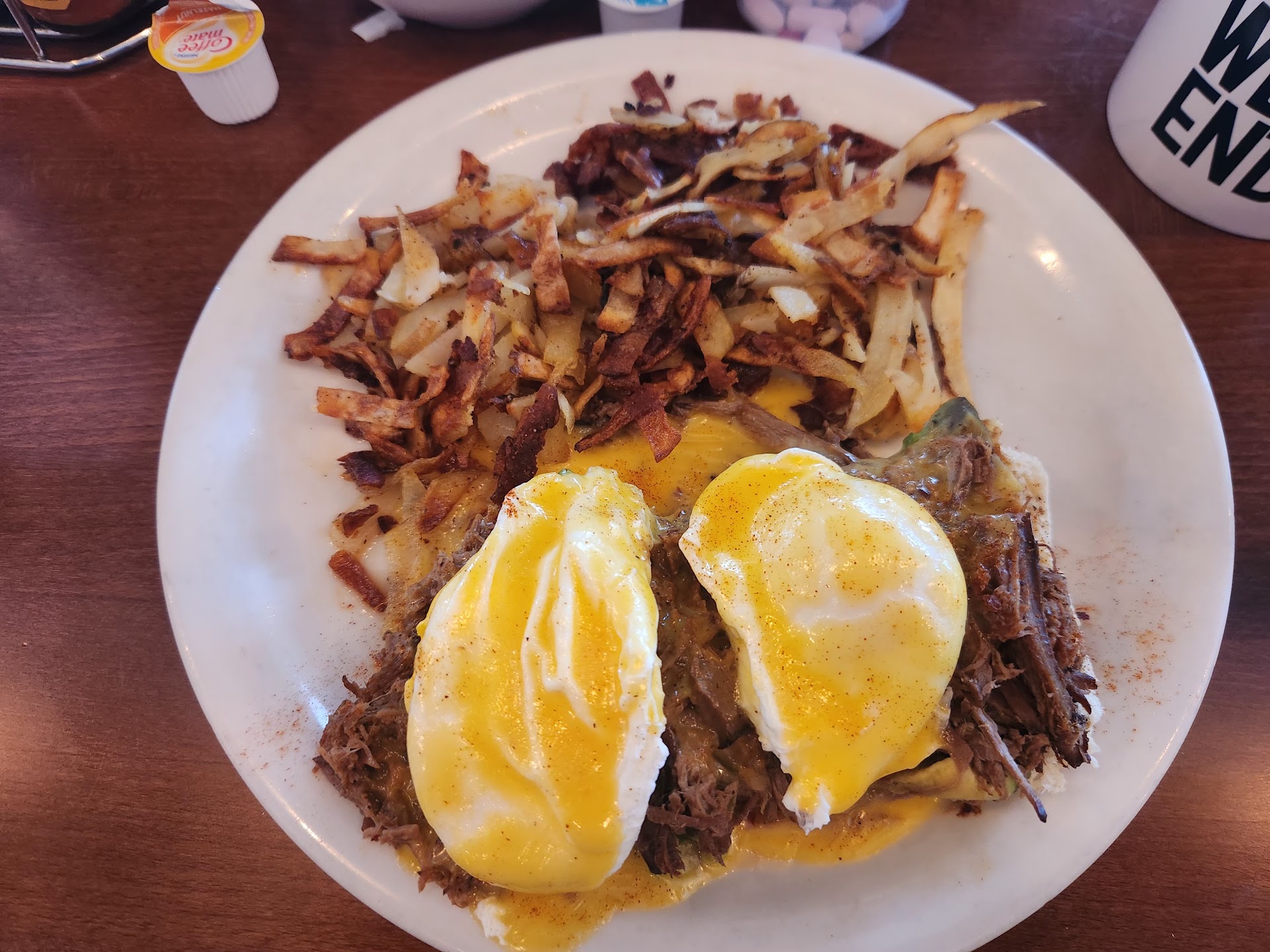 We were here yesterday about 10:30. It was a birthday celebration but we didn't advertise that. We (3) were seated right away but didn't get service for about 15 minutes. I was shocked to see that the wait staff wore shirts that said "I'm too sober to put up with this SH.." (four letter word), We aren't prudes but kids can read and what is it saying? They don't like their job? the patrons? We didn't see the humor. Our waitress was very kind, and attentive. It was so loud, so loud we could hardly talk to each other. We ordered, my husband had the brisket Benedict, which the brisket was great the hash browns the best we've ever had but the hollandaise was like cheese sauce not like hollandaise. Our son had an omelet and only ate half. He didn't complain or say it was good. I had the avocado toast special, but it wasn't written down and I asked for no bagel seasoning (was told there was none) and the waitress told me the rest but forgot to tell me about the hot honey. Came with bagel seasoning on the tomatoes. It was great but the honey ruined for me. We wanted a beer but none was listed on the menu, we only saw that they had beer on our way to the bathroom. These may not seem like big things but our bill was $100. Maybe we're too old to overlook the swear word and it's okay in todays society to have your staff wear shirts like that, but we had high hopes...