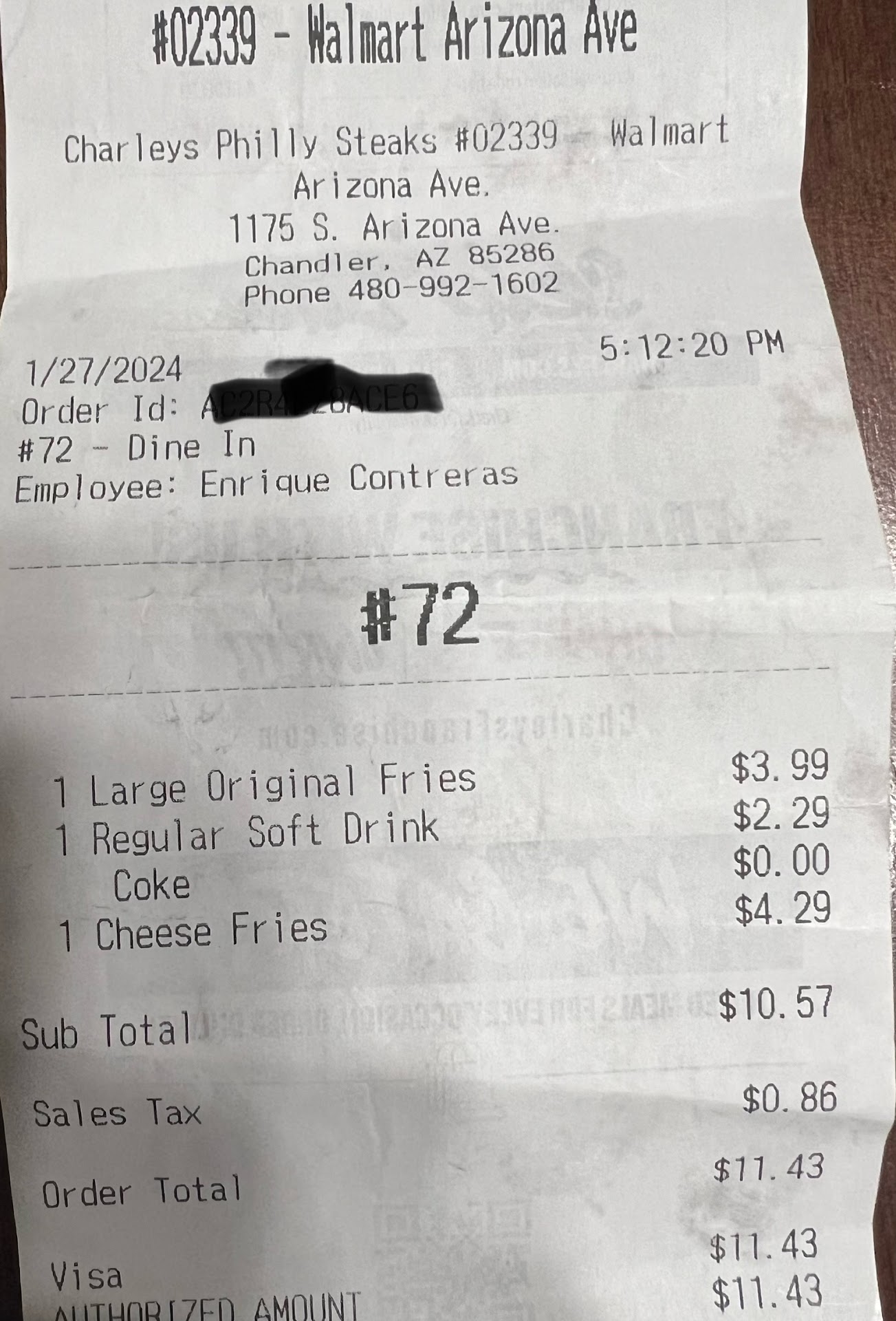 Today Jan 27th 2024 we had very bad experience. Whenever we go to the walmart we surely buy fries and coke. As usual today ordered regular fries, cheese fries and coke and cashier she took the ordered and we sat at the table and waited. She came with cheese fries with bacon on top of it. As we don’t eat meat and never ordered bacon cheese fries we told her our order is just cheese fries and not bacon on top of it. Showed her the receipt which shows clearly just cheese fries. She came with cheese fries and threw on the table very rudely. Felt like throwing on our face. I went back and informed other guy and explained him and told him it’s very rude. Even I told him I will pay for cheese bacon fries if they want me to but she no need be rude. I am going to stop visit...