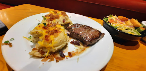 A gift card brought us here for dinner on this weeknight. Parking was wheelchair accessible, generous, and up front, and the lot was not full. The restrooms were clean, wheelchair accessible, and stocked. The dining room was 3/4 empty as we got there before an evening rush. We were seated right away. The menu has been upgraded with price increases and some favorites have disappeared. The 'Three for Me' menu selection is new since our last visit. A choice of salad or soup, an entrée, and a beverage, with upgrades in every category. My dining partner ordered off this menu: the 6oz sirloin, mashed potatoes, and a dinner salad. The mashed potatoes were better than most, and he said the steak was good. He is easier to please than me. I ordered a chili bowl and a chef's salad. The chili was a straight up disappointment. The only flavor was salt. Much too much salty. When I commented to the waitress, she said she hears that a lot, and she admitted it was canned. If this is a common problem, why is it allowed to continue? Alongside the chili, I ordered a Caesar Salad. That was also a disappointment. Caesar Salads are not usually made with what appeared to be a spring mix of greens, and what was served was the stem pieces of the greens. The house salad looked better and tasted better too. When it came time to pay, the waitress came by to assist us with the machine, as I said I didn't care to use it. Again, she said that most people do not like to use it, so she did it. She it required some questions. I refused to do this, so she answered them. If people don't like that either, why not adapt to what customers like? She was pleasant, but the policies are inflexible. That is a reason to not return, along with the...