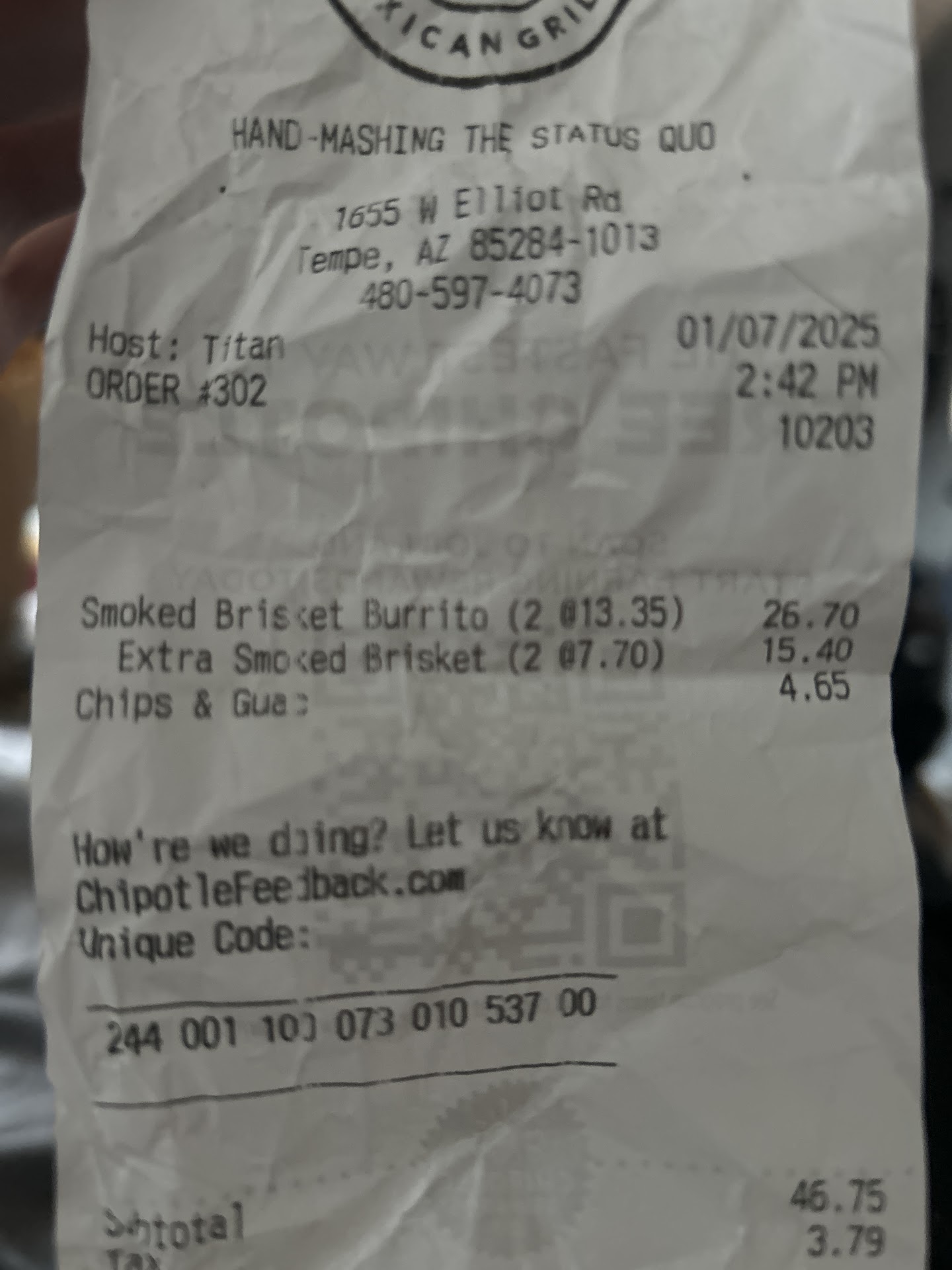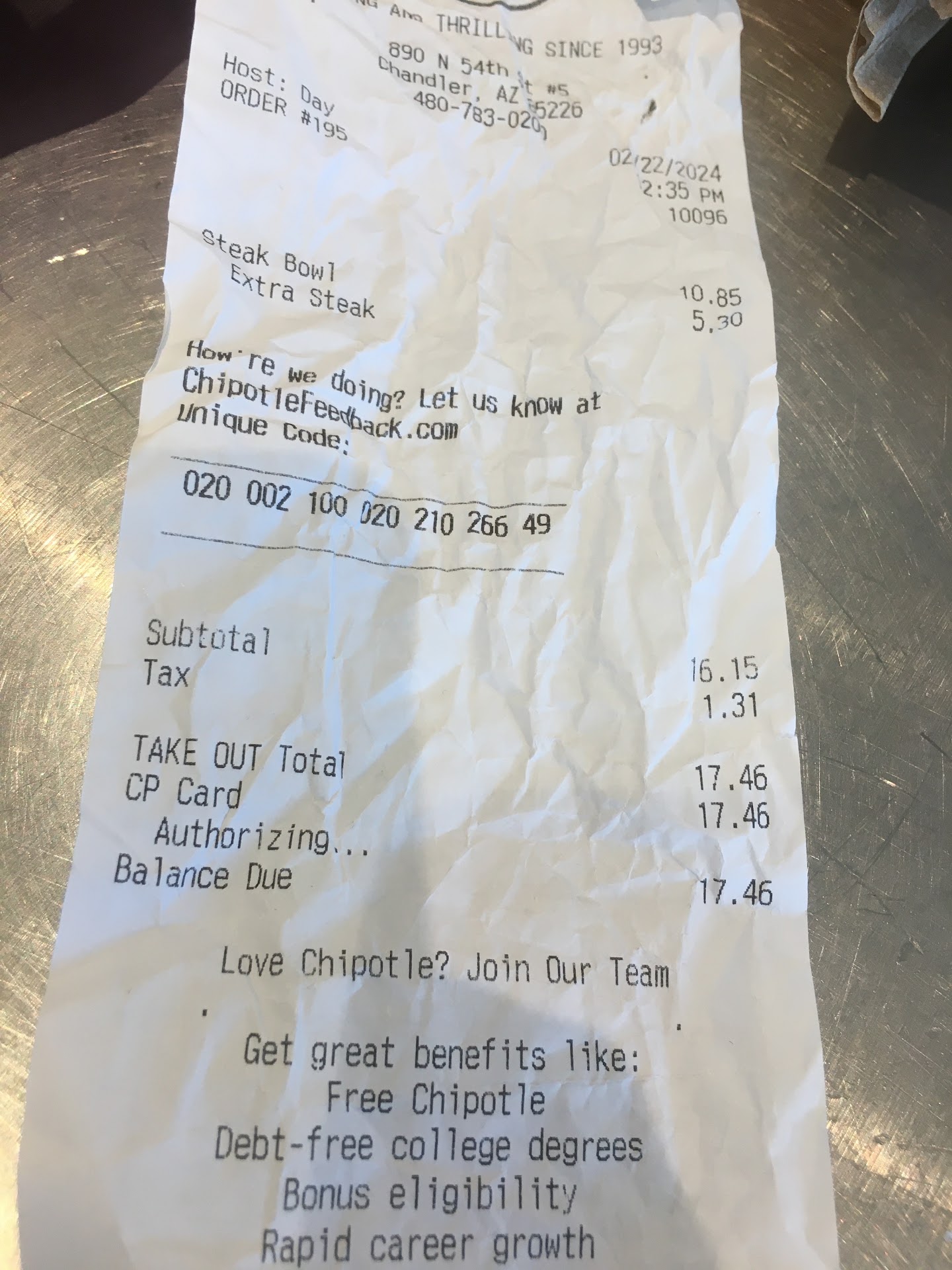 Read moreI started using Chipotle for catering and on pace to spend $2,000+ a year. My experience at this location tonight at 8pm is the end of me giving any catering business to chipotle. First off, the rewards system sucks when going to utilize. Over 9,000 points and you’re telling me I can’t use a drink and entree coupon together. It gets better, I selected a quesadilla entree as a reward before getting to the order taker, ask for a chicken quesadilla. Yeah, sorry sir that can only be ordered online and picked up, we can’t take and make it at the store…… huh, say what?!?. Attempts to try and sell me on two kids quesadillas.. no thanks. How about Chips and queso (since I already clicked the reward), “ohh yeah we don’t have any more chips (it’s 8pm), I know it looks like we have some in the glass but those are saved for take out orders.” Um, say what?? Not sure if it’s Chipotle or this location but they seem to appreciate their online business more than in-person.