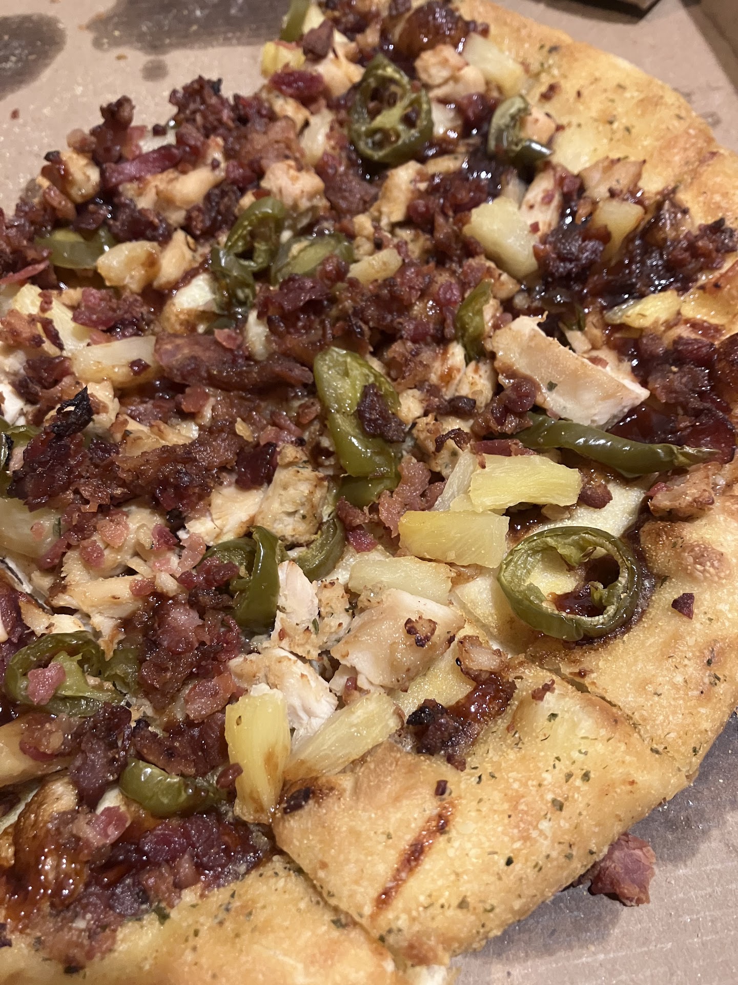 Picture shows overdone Buffalo Chicken pizza, extra large. Little chicken, little Buffalo sauce, which they thought overcooking would fix. It was terrible.