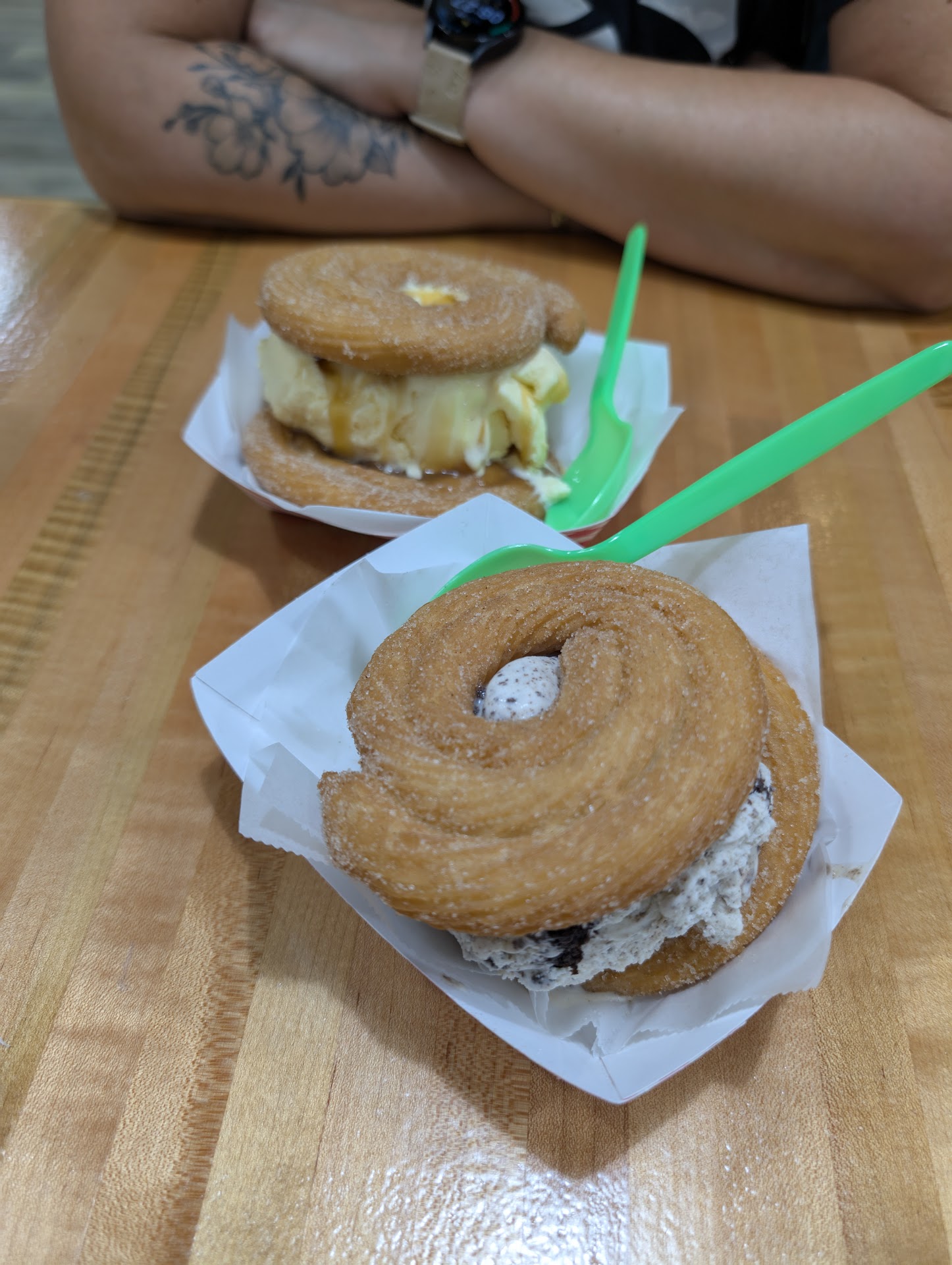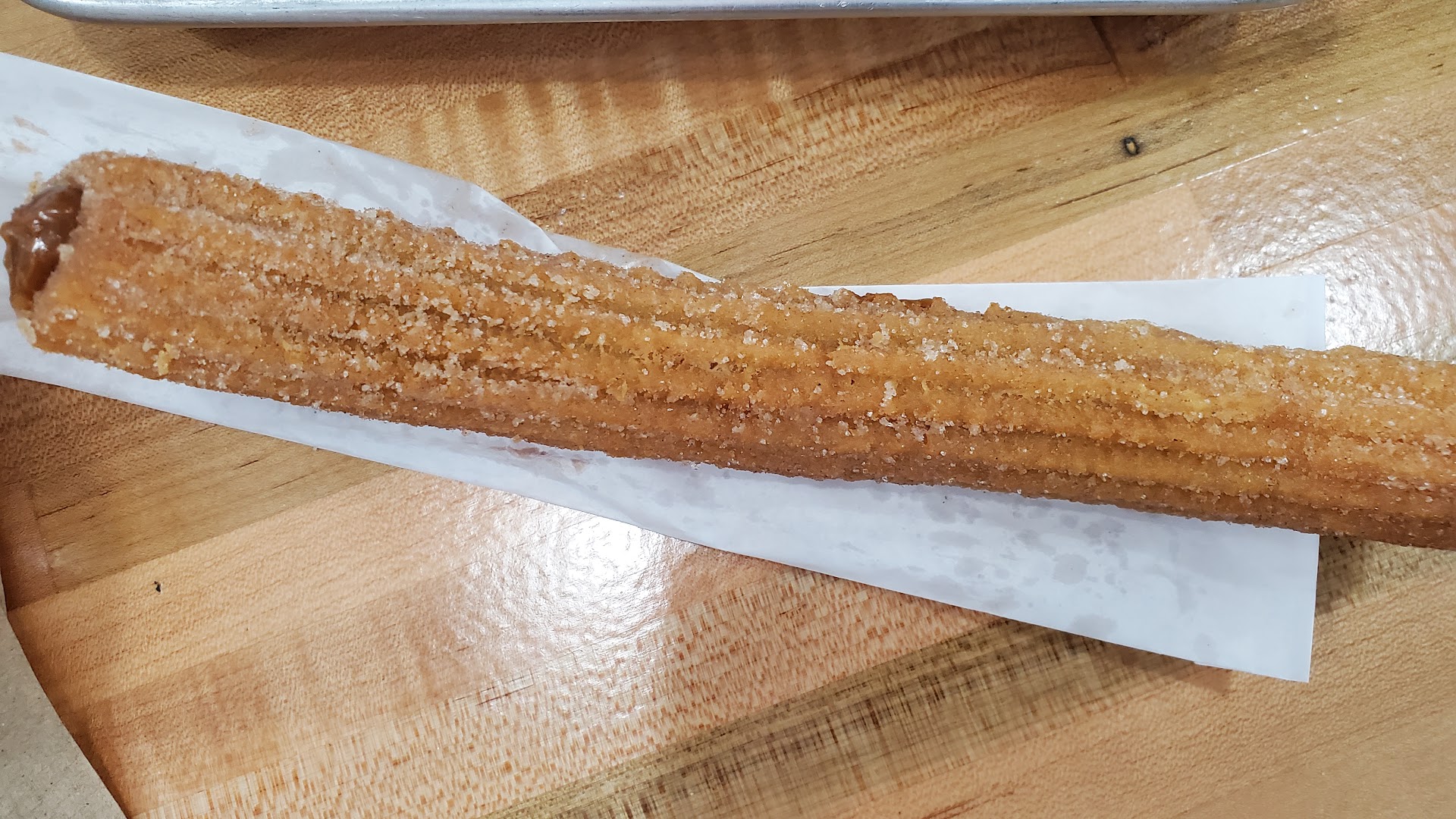 Churros were excellent. Staff was horrible. We walked in and stood there for several minutes while one of the staff was making an ice cream churro dish, and the other was talking on her cell phone. Then someone walked in with a case of soda, and the cell phone girl went to the back and had a lengthy conversation. The girl making the ice cream dish was making it as slow as molasses....... Neither of them acknowledged us when we walked in. We stood there looking directly at them both....nothing. After a few more minutes the girl in back finally came up front and did something at the register and returned to the back.....still not even a "hello" or "be right with you" The girl making the ice cream dish finally finished and served it to the customer sitting at the table. She then looked to the girl in the back like a deer in the headlights.....the girl in the back finally finished talking to whomever delivered the soda, then came to the front and took our order. We waited while the churros cooked. We saw our order placed up. We waited a couple more minutes while the cell phone girl walked past our order a couple times......I'm a patient person, I could understand if the place was packed...but we were the only ones waiting to be waited on.....staff needs to be trained in customer service/acknowledgement. Great churros, but not likely to go back due to the...