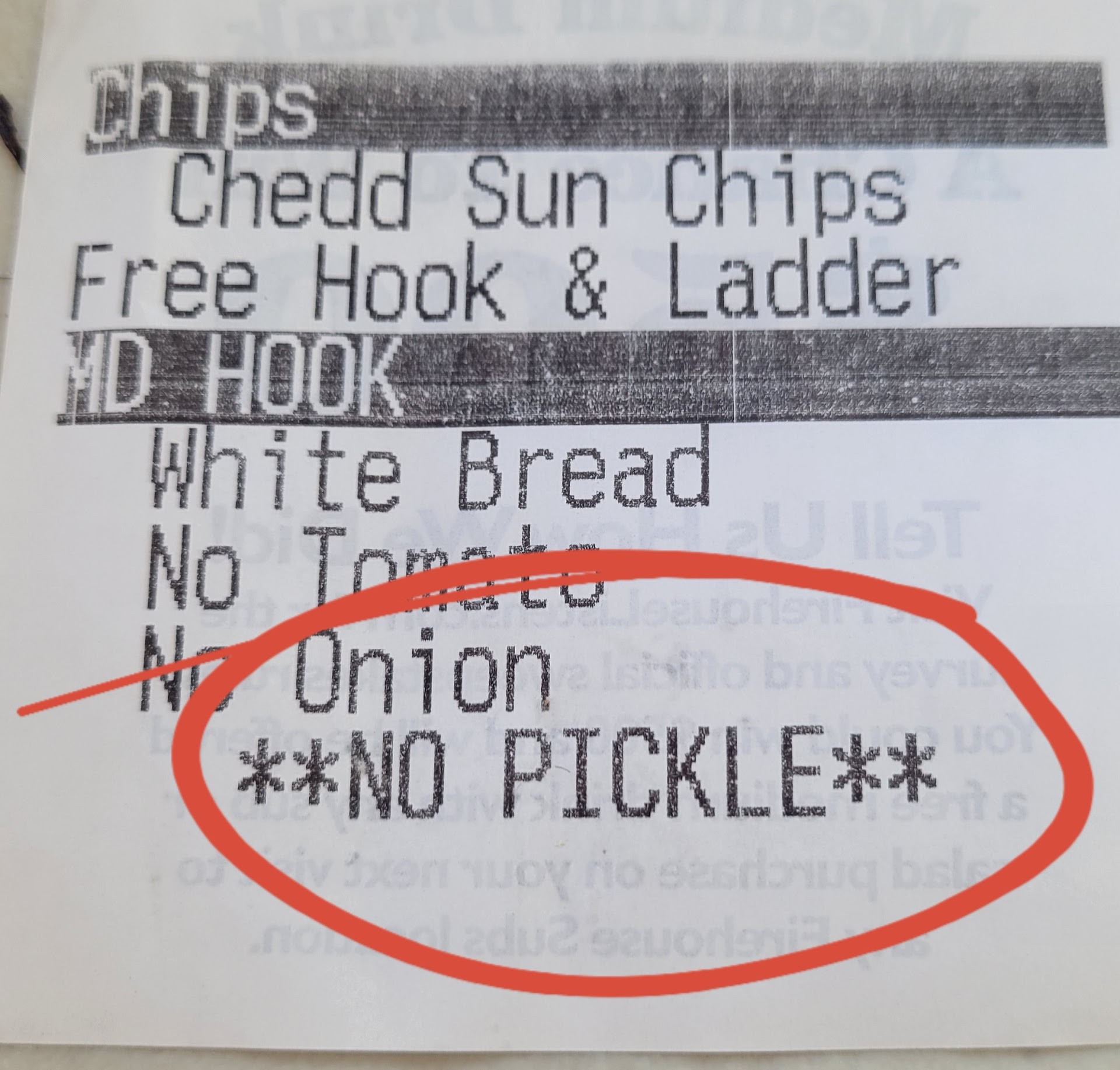 Aug 2: Yet again open my bag pulled up in every sandwich not a single pickle spear. I asked, and the employees looked at me perplexed like I was asking for free stuff or something when it says it in huge letters under each sandwich on the receipt and the online order.