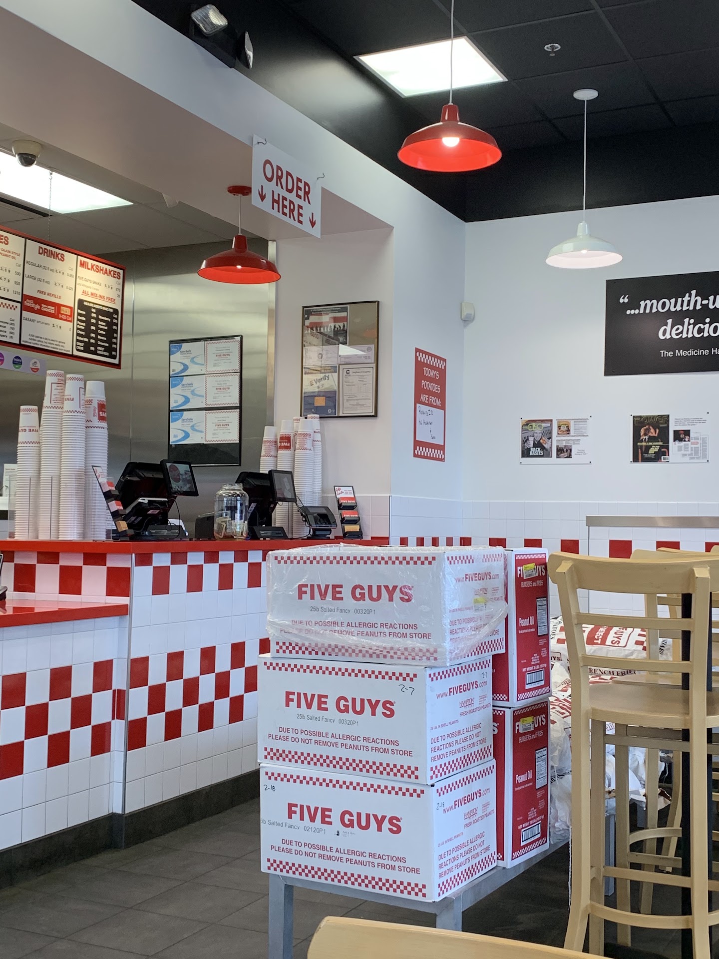 Read moreWas looking forward to trying five guys for the first time. Especially after all my co workers said we have to go. So we decided to take our lunch and give it a try. I was highly disappointed. They were obviously busy but telling us it would be no longer then a 15 min wait and asked if that was OK. I made sure the understood it was absolutely fine but we didn't have time to wait much longer due to our lunch schedule. We didn't receive our food till after 11:07 and we ordered at 10:30. On top of that they were offering people discounts after us but never apologized to us. The lady helping at the register was confused and kept handing people the wrong orders. It was an absolute mess. Unfortunately die to this experience I'm never willing to give 5guys another chance. Go to in n out. Beside that 34$ for 2 burgers. You've got to be kidding me. Support another business. I know food costs have gone up but definitely not...