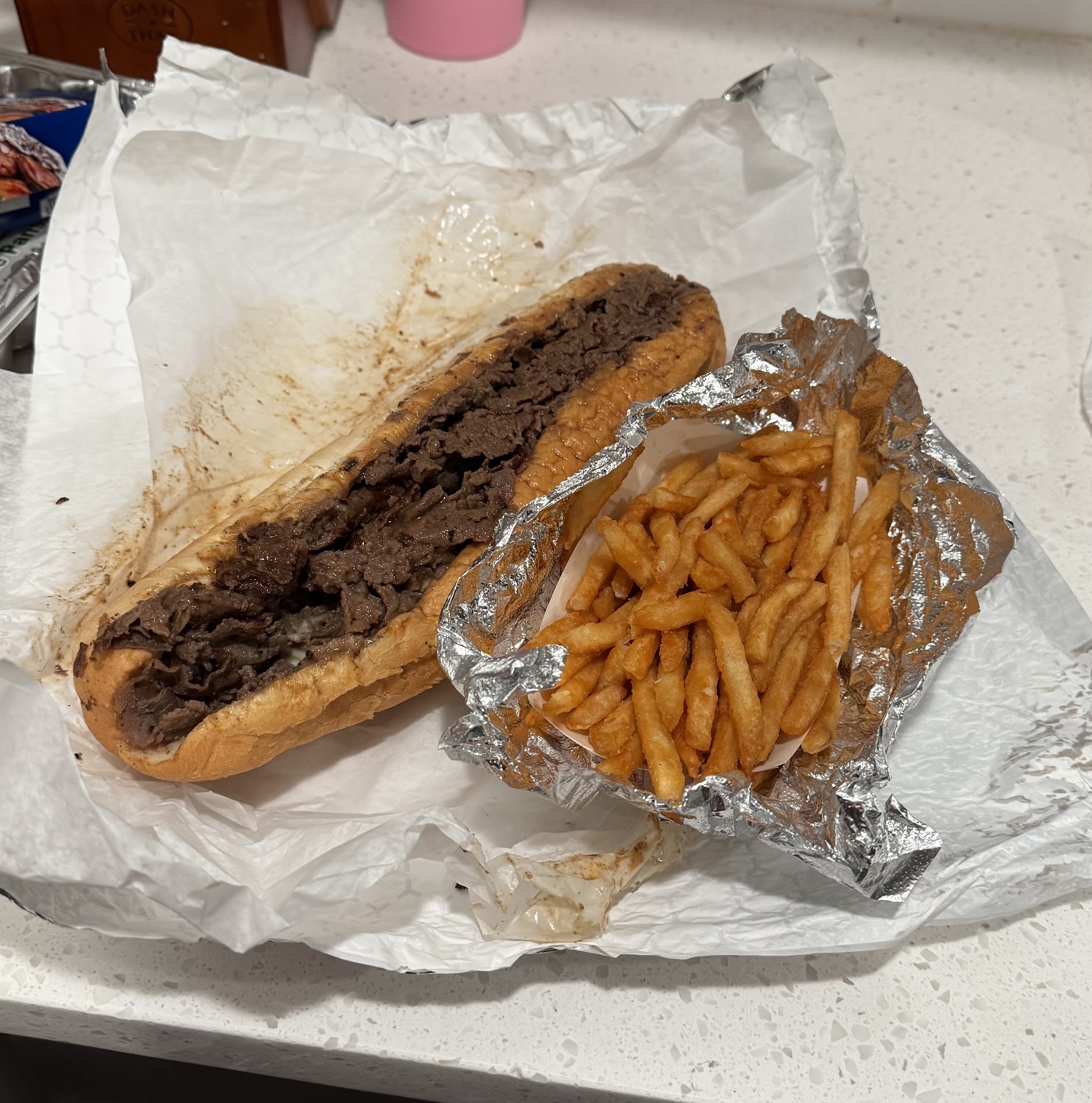 I'm from Pennsylvania so when people talk about Philly steak and cheese sandwiches, you're really talking about a whole family tree of different sandwiches. They can be made with cheese whiz, they can be made with provolone, mozzarella, lots of onions, no onions, green peppers, no green peppers, sweet peppers, you name it - if it's on the menu, they're going to throw it in there. I got the regular Philly steak and cheese with provolone and sweet peppers. Although there were a few green peppers in there, they didn't charge me for them and I don't mind. I also got the sweet potato french fries with a little bit of sea salt on them and you get a free drink. I paid $20 for the whole meal. Do I feel like I got $20 worth, I do. I feel that that was an fair price for the meal that I purchased.