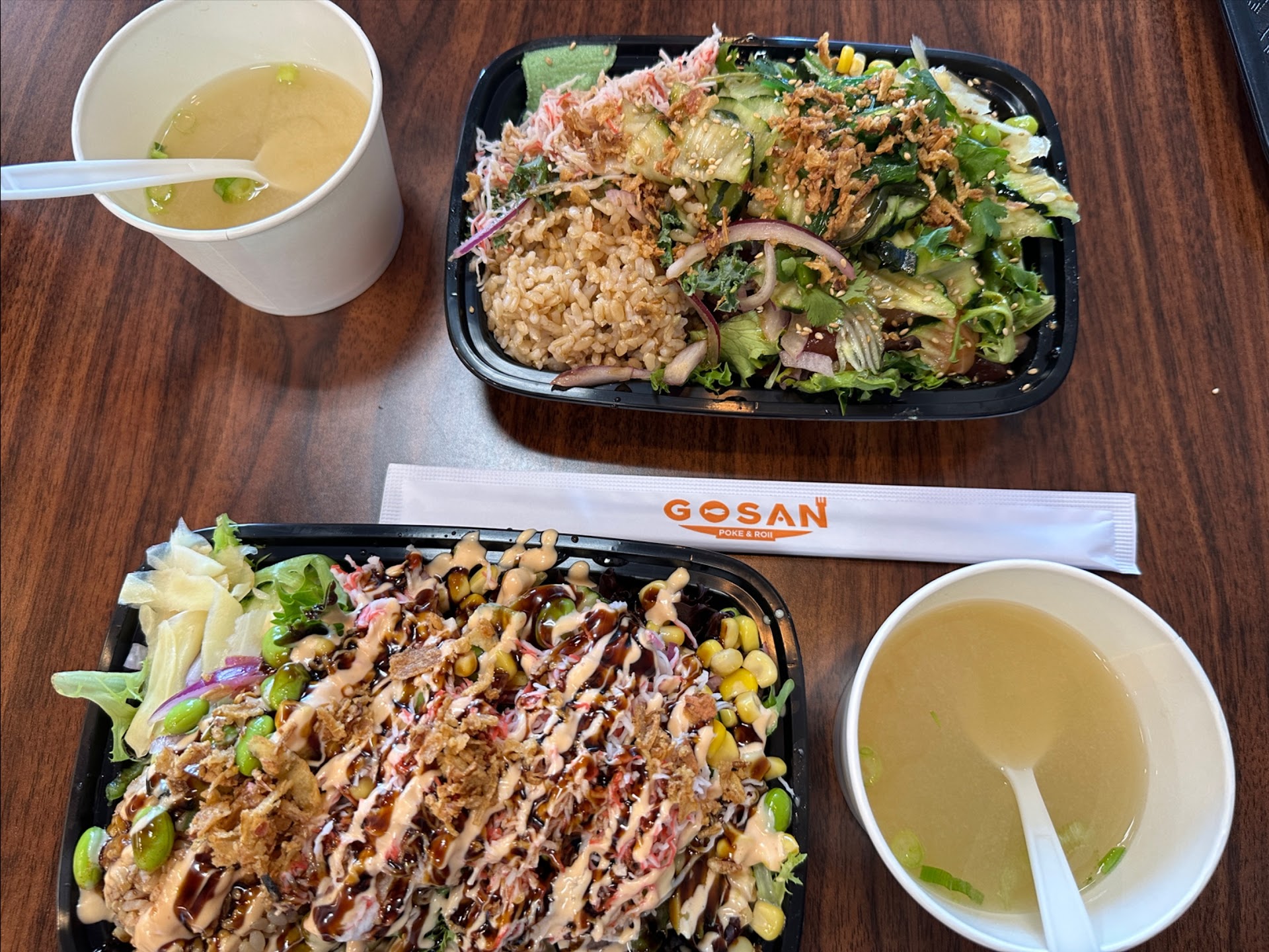 I ordered 3 sushi rolls, so I canāt speak for the poke bowls, but I did ask when I picked up my order if there was already soy sauce and eating utensils in the bag. She said āyep!ā I should have checked the bag myself, but I didnāt since she sounded confident it was all taken care of. So I go back to my hotel only to find there is not a single napkin, no chopsticks or eating utensils of any kind, one wasabi packet (which is fine because thatās all I needed) but only ONE tiny packet of soy sauce for 3 rolls. I was so upset. After just having been on the road for over 3 hours, I was exhausted, hungry, and did not want to get back in my car.