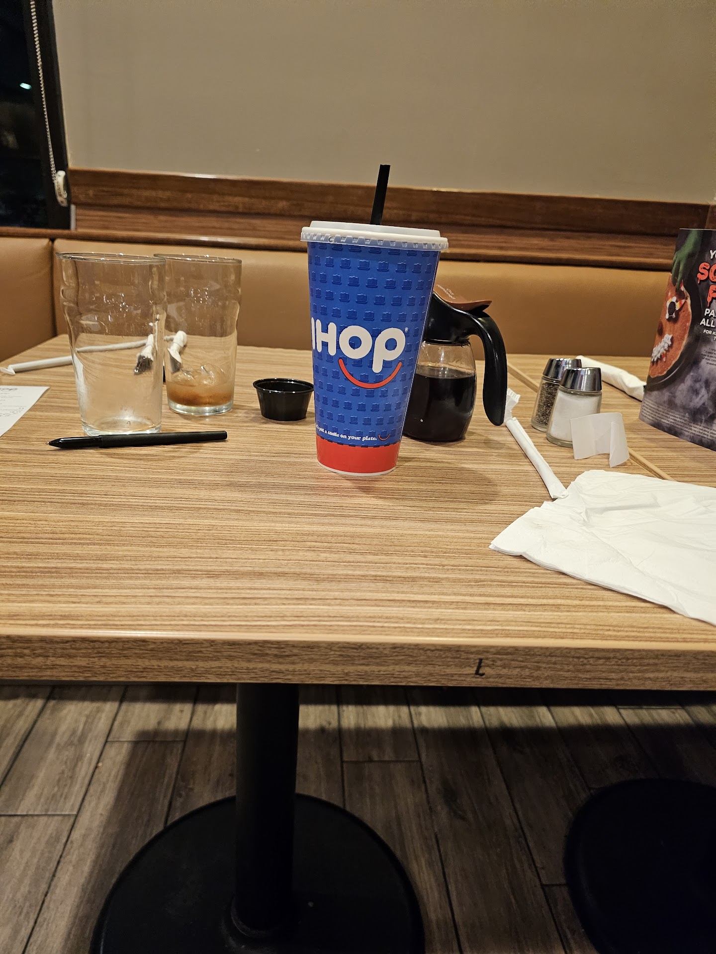 Read moreFood places just stop trying at night now. I went to I-Hop and just wanted some pancakes. I saw they had these cheesecake pancakes on the menu and they sounded pretty good. The normal bad night service of taking 15 minutes to get seated when there's only one other person in the restaurant and another 10 minutes to get a drink and for them to take my order. Well the pancakes come, they look normal. I eat two of them, they taste the same as regular pancakes. I don't notice any cheesecake, but I'm also not sure if I'm suppose to as it's the first time I've ordered this. Just to be safe, I asked the waitress if there was cheesecake in the pancakes or if I'm suppose to be able to see it. They said, "Dunno" and walked away. About another 20 minutes goes by and I finish the two remaining pancakes, waiting for the waitress to show up again and she comes by and says, "Chef says they forgot the cheesecake." So there are a lot of actions you can take at this point. You can refund the dish, replace the dish, give a discount, apologize, ring them up for regular pancakes, give a gift certificate for next time, or something. The waitress chose none of these and just dropped off the check. I head up front to pay and was going to ask if I could just be charged for regular pancakes, but it took her literally another 20 minutes before she came to ring me out. Pretty sure the other table just left without paying because I saw them waiting to cash out long before I...