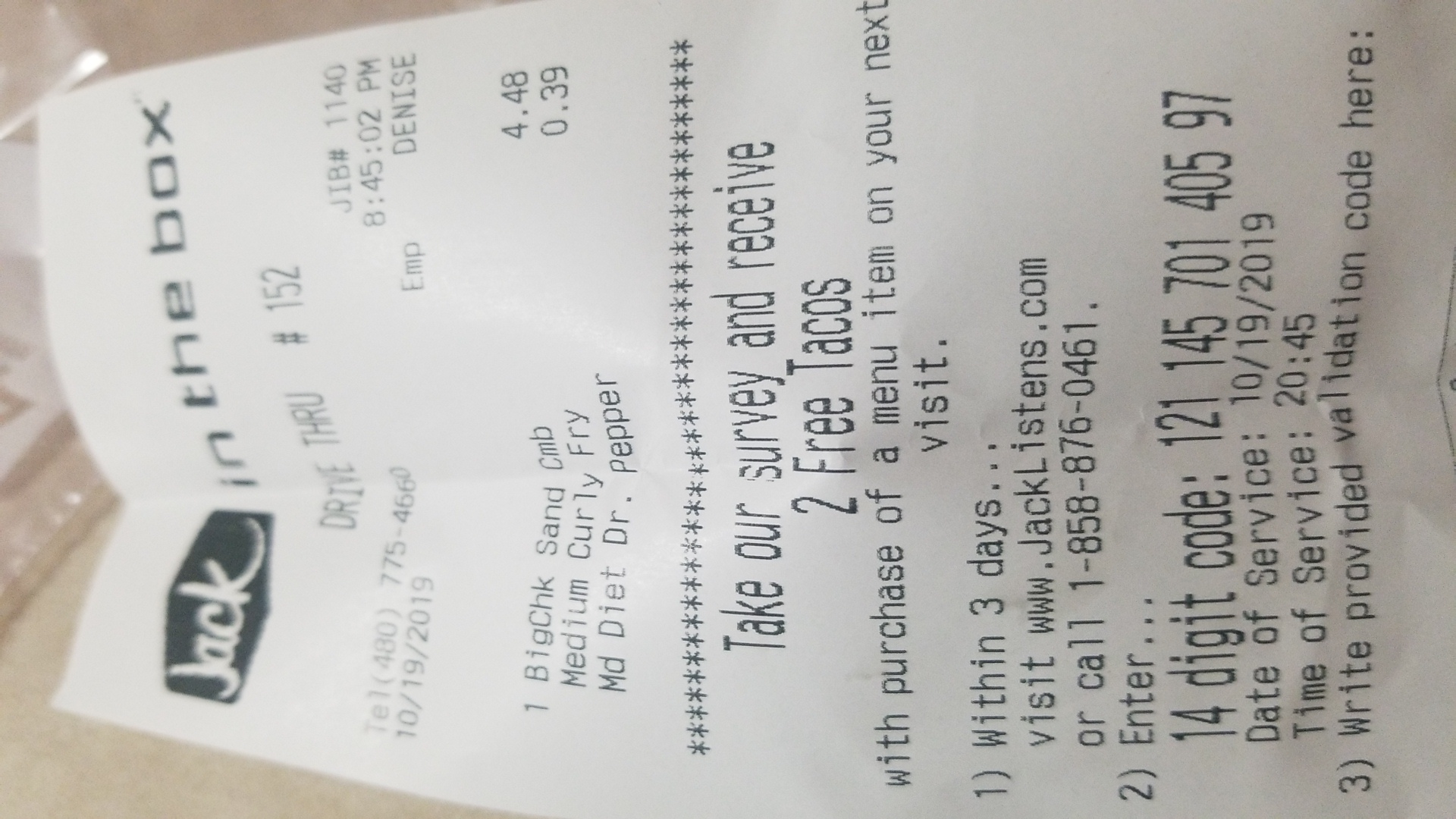 Read moreWe love going to Jack in The box to get their extreme sausage sandwich when we have to go for an appointment or are out running some errands. However it seems like every time we go it just gets more and more and more expensive. This time we went we got an extreme sausage meal and my husband got a cheeseburger meal and one order of egg rolls. This added up to over $30. We decided then and there that we were not going to go here ever again to get takeout. We can go and sit down for a nice dinner and spend $10 Or $15 more at Texas Roadhouse. When did having a breakfast sandwich and a cheeseburger add a takeout joint become so expensive? It's just absolutely ridiculous. Please places should be ashamed of themselves. How can they charge this much when you can go for a nice sit-down dinner for a little bit more and get a full meal not...
