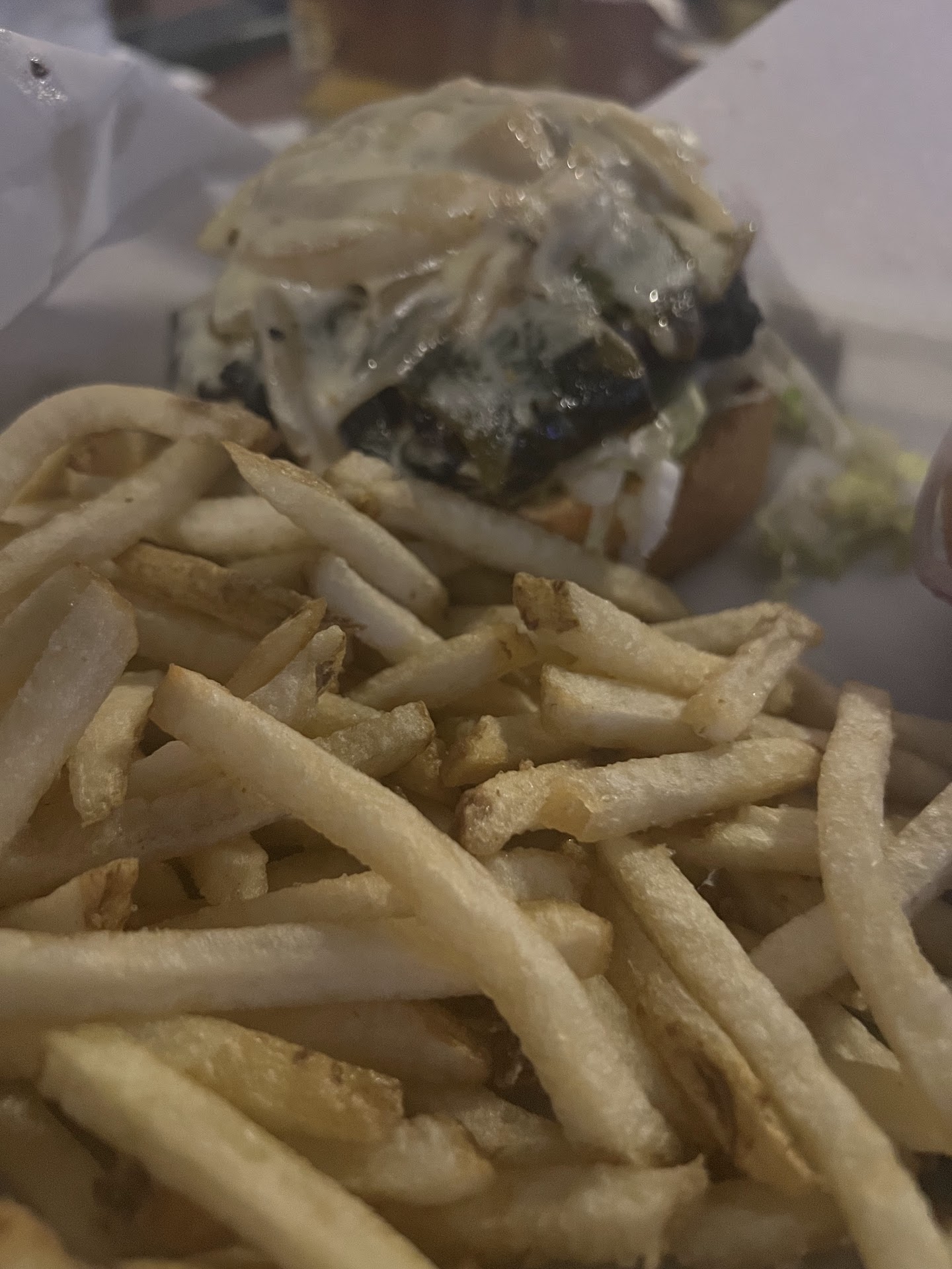 Out and about on one of our random adventures and decided or stop in and check out the first random local spot we came across. We noticed an outside patio with TV’s so we stopped to possibly check out some of March Madness. The location is easy to access from any direction so that that was great. Upon entering my first thought was man it’s dark in here. So dark I thought my old lady eyes wouldn’t even be able to read a menu. Luckily I succeeded without a flashlight this time. Second thought was do we seat ourselves or stand awkwardly at the door since there were no signs or employees to be seen besides the bartenders. And last but not least third thought was how loud it was. With music blaring and a group of pretty loud men who’d already had a few lol. I know this review is starting off pretty negative, but we decided to stay and give it a try. It is a sports bar kinda vibe so it definitely wasn’t going to be silent. We decided to pick a booth and see what happened. We found menus on the table and right away a waitress came over. That was good as she saw us before we saw her for sure. She was friendly, took our drink order and gave us time to look over the menu. She came back with our drinks. We ordered a beer on tap and some waters. When she came back I had chosen their green chili burger and a half order of nachos with ground beef. Then we waited. Service got a bit slower at this point, but she did come by and check on us a few times. Everything looked great when it came out. Good thing we ordered the half nachos because they were stacked up. I can’t imagine the size of a full plate. Fries were good. They were more shoestring than your larger ones elsewhere. My burger while ok and cooked to my request was a bit bland. I tasted more onions than green chili or anything else. A bit of a bummer but wasn’t horrible. All in all if you’ve come to drink this is definitely a popular local spot. Unfortunately no pics of the nachos because my group loves to dig in on purpose so I can’t ha ha . For me this go round it was more miss. If in the area again I’d give them another try.