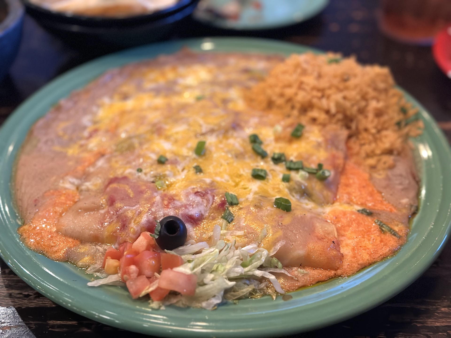 Read moreStopped in for lunch today. I ordered the senior cheese enchilada with rice and black beans. The enchilada and rice were very good. The black beans were fine, just nothing special. My husband ordered the combo chicken burrito and cheese enchilada with rice. He enjoyed the enchilada but was a little disappointed with his burrito. We should have asked when ordering if the burrito had a sauce on top, something he is used to at other restaurants It did not come with a sauce so he felt it was a little dry. He had only about 3 bites left, when our server finally came around and he could ask her for a little extra sauce. He was practically finished with the rest when the server returned with the sauce. When she arrived he asked how much extra for the sauce and she told him $1.90! He told her that since he was almost done now, he did not want the sauce and also felt that was quite high for extra sauce. She kindly took it back. He will know not to order burritos the next time we return. Unfortunately, our server was very slow in getting back to us when we asked for the check and never came back to get our payment. The manager took care of handling our payment. I did see other tables waiting for her also. Larry, the busman, was a very efficient worker. Came and took our plates, filled our iced tea and asked us if we needed...