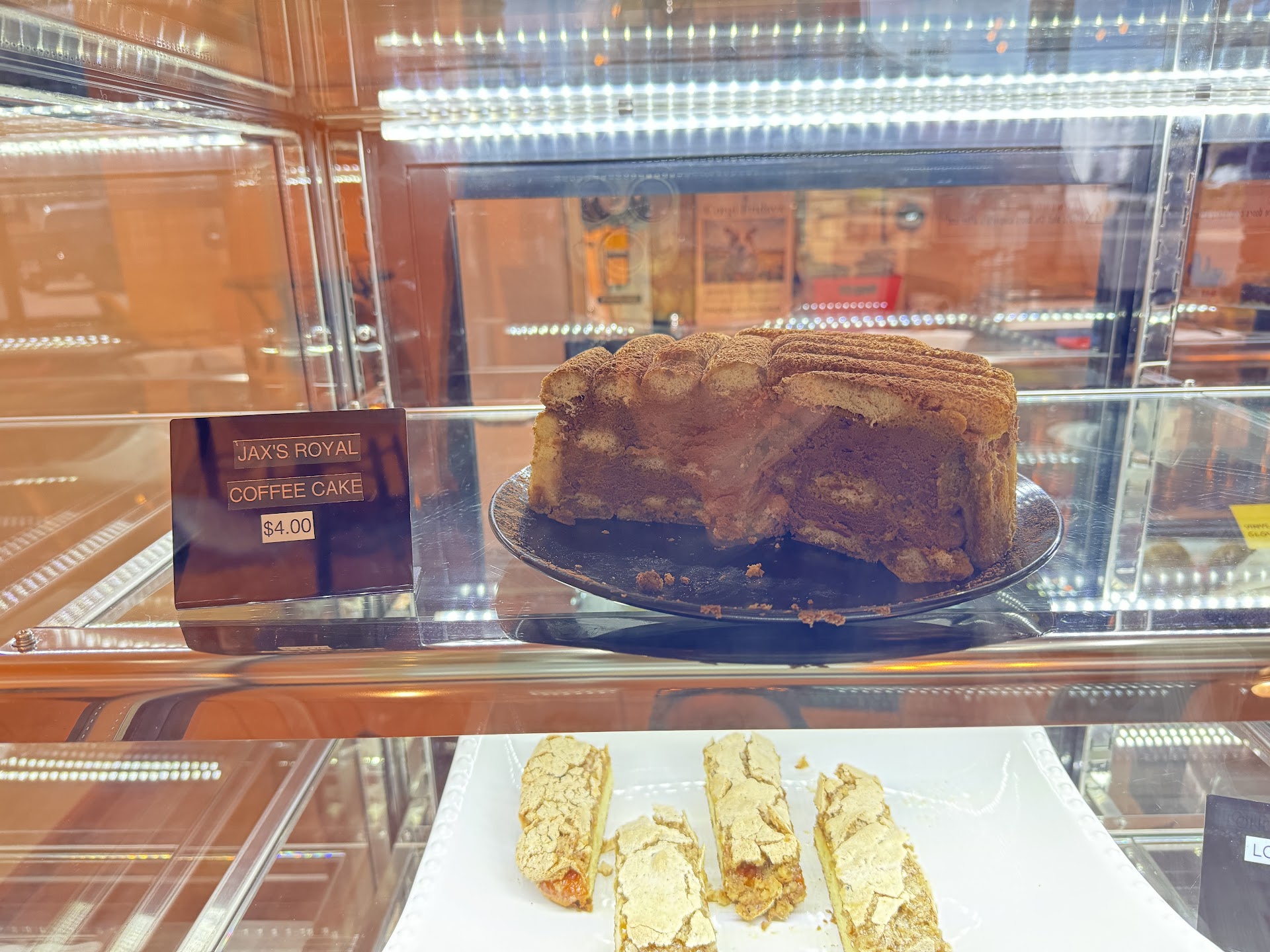Mina’s mom makes the best coffee cake fresh, called “Jax’s Royal Coffee Cake”. It’s layers of lady fingers and a fluffy chocolate mousse cream. I always love to grab a slice, but it’s very popular and sells out fast. The cream puffs are also a favorite. They import the croissants from Europe and I can taste the difference.
