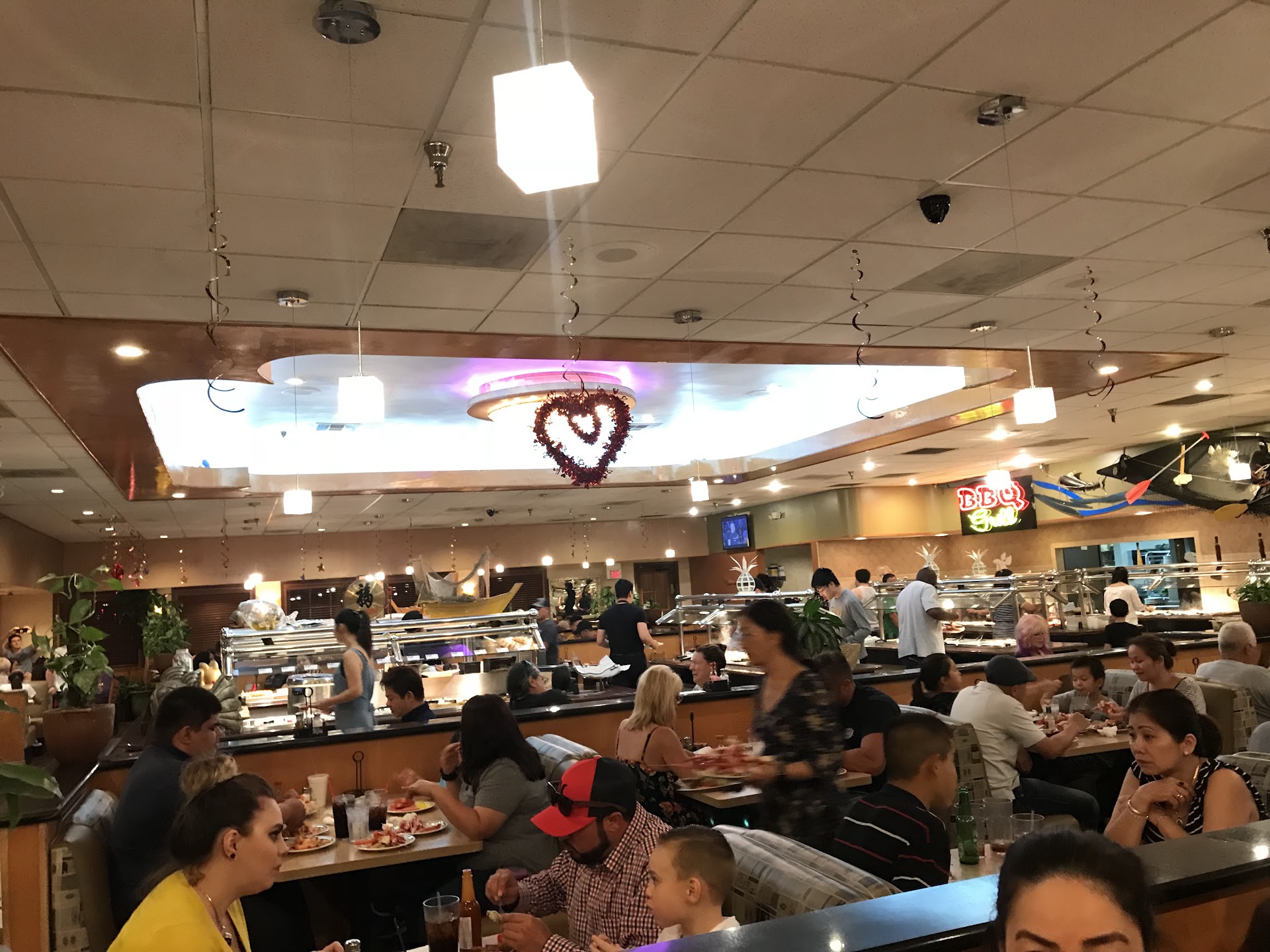 Food: 6/10 (alot of disappointments, but they do a few things well.) The snow crab was great, but came out twice in 3 hrs. The fried shrimp was uncoated, greasy and barely seasoned. (On previous visits, this shrimp was coated in a beautiful crispy batter and the shrimp was moist and flavorful.) The blue crab was extremely oily and the batter was chewy and did not coat the crab well. The flavor was good though. The green beans were excellent. They did not replace the cold oysters in 3 hrs so i didnt get to try them. I usually go for the green lip mussels as well, but they were not on display. The sushi did not look appetizing so I didnt try it. The ribs were ok. The noodles were good. The hot and sour soup was great. I did not have the energy to try a grill plate.