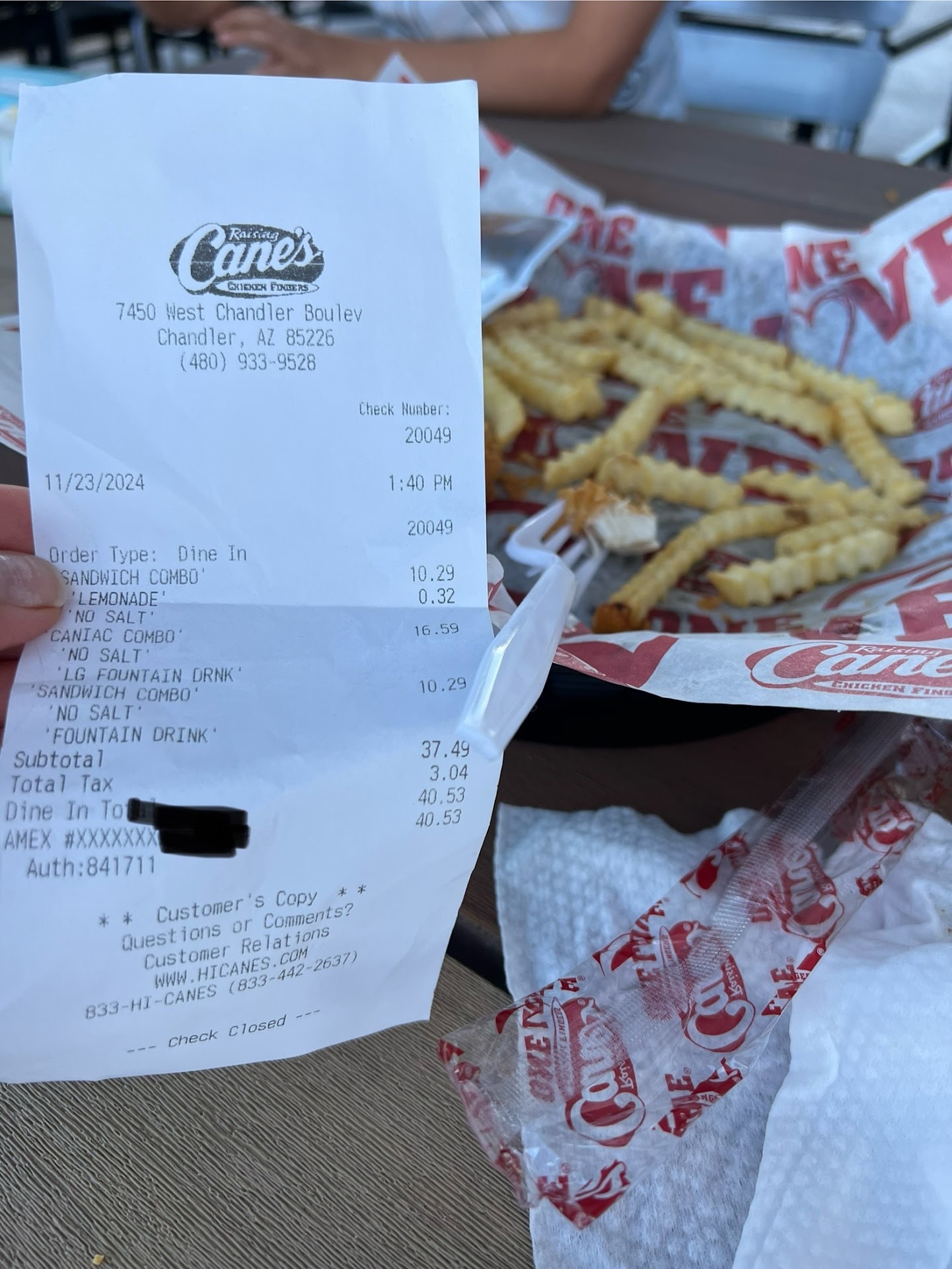 Read moreEvery time I come to this location they get something in my order wrong and the food tastes like it’s been sitting, always lukewarm. I wasn’t able to check my order before leaving to make sure everything was right this time because they pushed me out of line. They forgot my straw, extra sauce, and ketchup and gave me a single napkin. Tired of paying extra for stuff and then getting the standard way the meal comes, just feels like they don’t even check it. They’re also really bad at portion control because sometimes I’ll get a super tiny chicken tender and I feel gipped. Makes me not want to spend the near $15 it is to get a meal here especially with the long wait times. A lot of times one lane goes so much faster than the other which doesn’t make sense because the only thing on the menu is chicken tenders and fries so everyone is basically ordering...