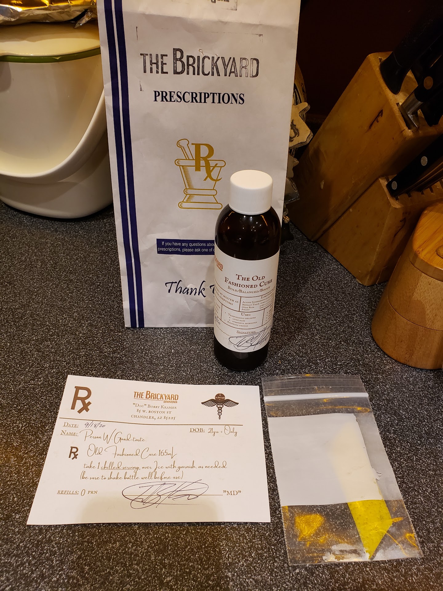 We decided to order a bunch of appetizers, to have a tapas dinner at home. Wow, we were not disappointed! We tried their great happy hour special, 4 appetizers for only $30! Great deal. We couldn't stop there, had to add the yummy Hamachi, and of course the gourmet Mac-n-Cheese. Candied Pancetta is not to be argued with when it wants to be eaten... The Pork Belly, Sliders, Cauliflower, Banh Mi Tacos, Hamachi, Mac n Cheese, all spectacular. And then there were the sauces. Every sauce that they prepared had its role in the play on our tastebuds. I couldn't tell you any of their names, but I can tell you that they each turned up the flavor to 11. Each appetizer was amplified by the addition of the matching sauce, we tested that scientifically with our tastebuds. On to dessert. We got the campfire cheesecake. Its a s'more, and a cheesecake. Graham Cracker, chocolate cheesecake, marshmallows on top, and a sauce that tasted like toasted marshmallow custard. Ohh, yeah, did I mention that the marshmallows were perfectly toasted?Wonderful is the superlative that comes to mind. And now the drinks! HOORAY! They have the absolute best presentation of drinks in the entire quarantine-i-verse. They are prescriptions. In so many ways, this is perfect. It was certainly just what the Dr. ordered. Actual prescription bag, brown tinted medicine bottle, signed prescription for preparation, garnishes carefully prepared in separate containers, a run-on sentence here, salt for the rim of the glass, ph-adjusted ingredients to prevent flavor-spoiling oxidation of the medicine. Just amazing before you even taste, and then they get better(and so do you). All-in-all, a fantastic way to wrap up a long week! Many thanks to he Brickyard for creating such wonderful food. We certainly need experiences like...