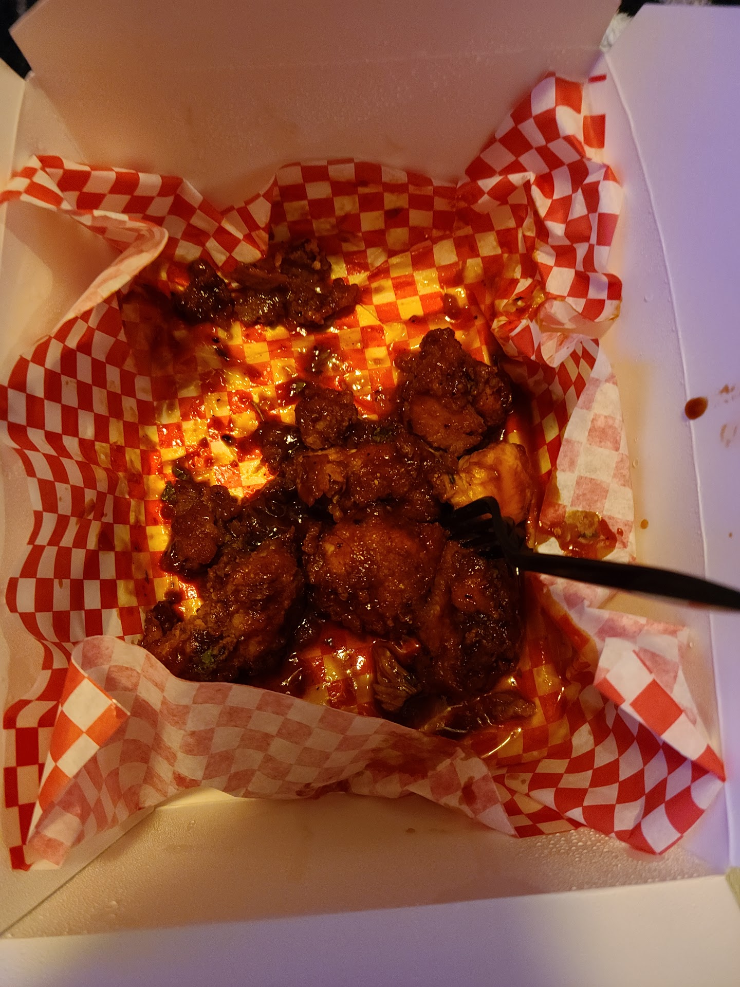 Just "finished" our meal. And by that, I mean the hush puppies were ate completely, one of my bone in hot wings of the sixteen were ate, and a little bit over half of the sixteen of the barbecue cilantro lime.