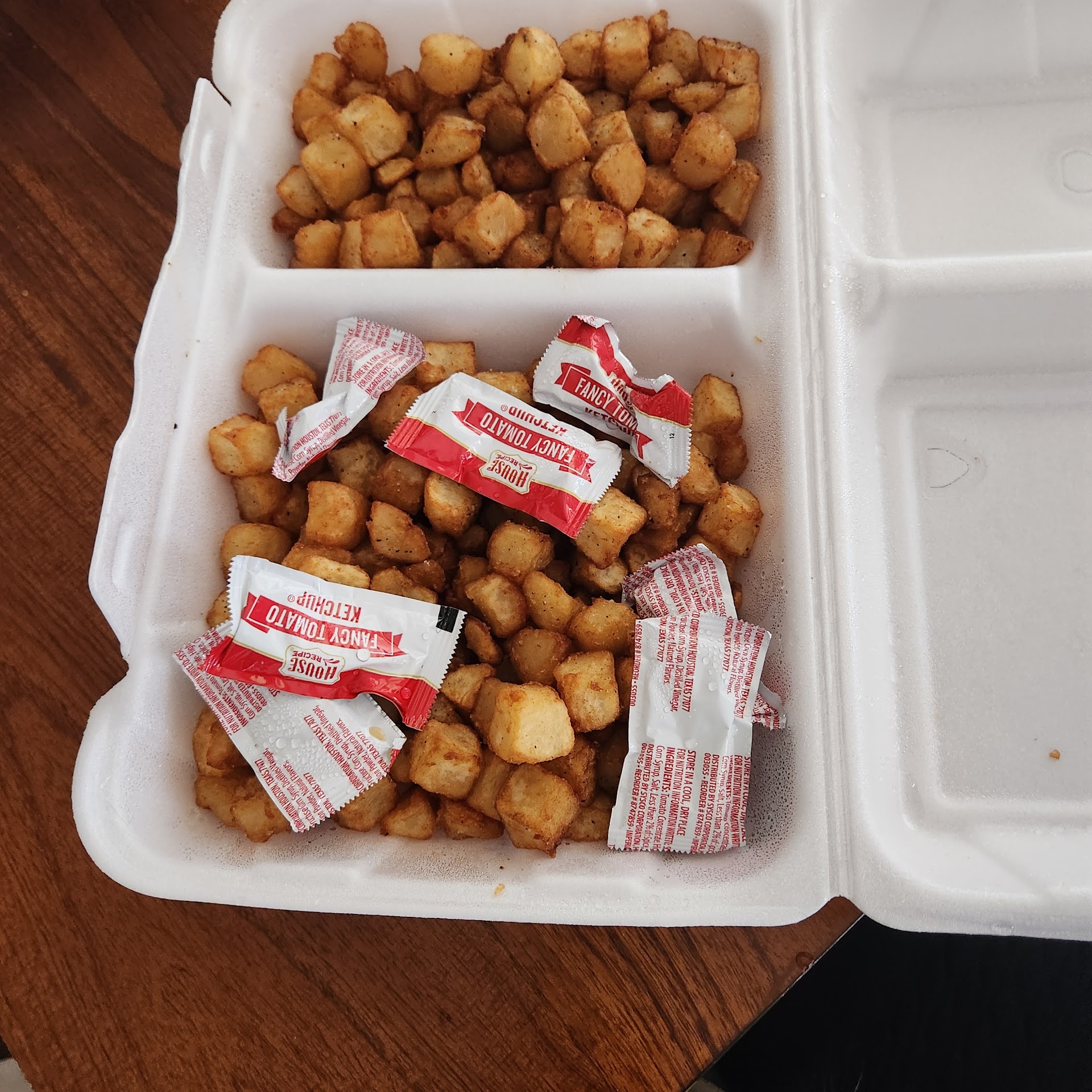 This visit had something I've never seen and now I know why...ketchup packets thrown on top of the potatoes inside the container. In case you have never experienced this, you should know that foil packets get REAL HOT when placed on top of freshly fried food. About the time I got it home was peak lava temperature...just in time for me to grab them.