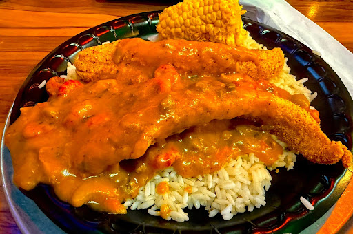 Wade and myself got the lunch special (crawfish étouffée over two crispy catfish filets, on a bed of rice, served with corn on the cob). My oldest got the 8 piece shrimp dinner and their friend got the shrimp poboy.