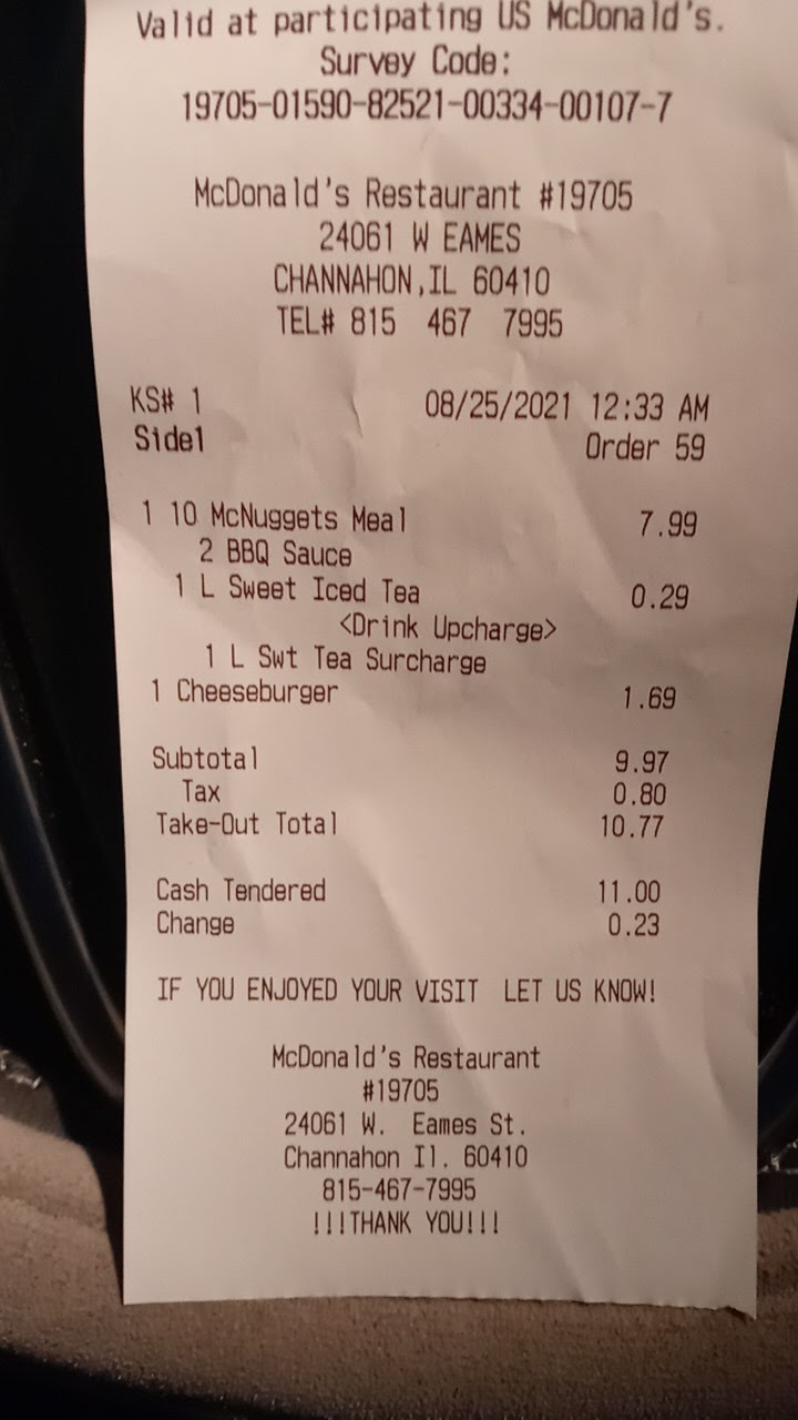 Read moreDon't waste your time or your money! This is by far the worse McDonald's there is, they make up there own prices as they see fit to try and rip you off. Stopped in there today, ordered 2 Sausage and Egg Biscuits they wanted to charge me $8.94 cents. On the wall it said but one at regular price $3.49 get the second one for $1.00 more. The manager is a rude and obnoxious person that needs to go back to corporate and be retrained. I refused to accept the order and instead ordered the two sausage and biscuit special 2 for $2.00 and she treated my daughter and I like garbage. The McDonald's is inside a BP Gas Station that they share together space together, the place is filthy and smells of mildew. The restrooms look and smell as if they haven't been cleaned in months if not longer. Plastic bags over the urinal, the sink was disgusting. Floors were sticky to walk on. So if your headed west on Route 6 there is another McDonald's about 3 1/2 miles from Interstate 55 which was much cleaner. We ended up stopping there and getting lunch on our...