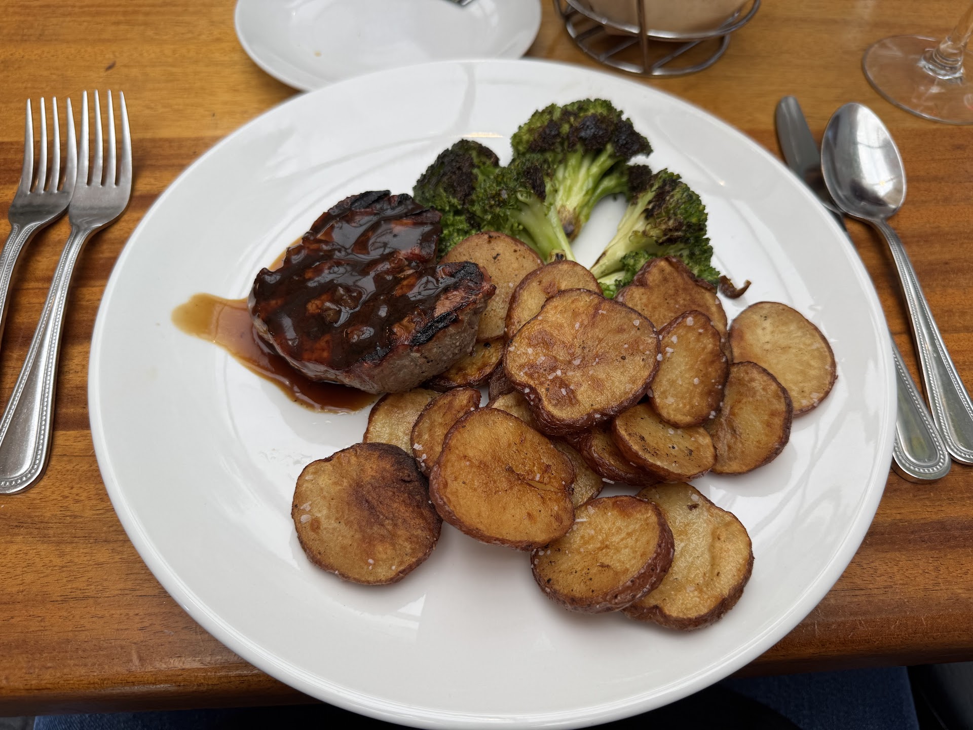 We were moderately disappointed by the food, although I thoroughly enjoyed their Peach & Prosciutto Pizza. That was by far the best entree, and the Crème Brûlée was very good as well. The Wood-Grilled Tenderloin was perfectly cooked but over-charred on one side and quite under-seasoned. It needed a fair amount of salt & pepper. My wife’s Wood-Grilled Salmon was similarly under-seasoned, even though it was also cooked to the perfect tenderness. She did enjoy the mashed potatoes.