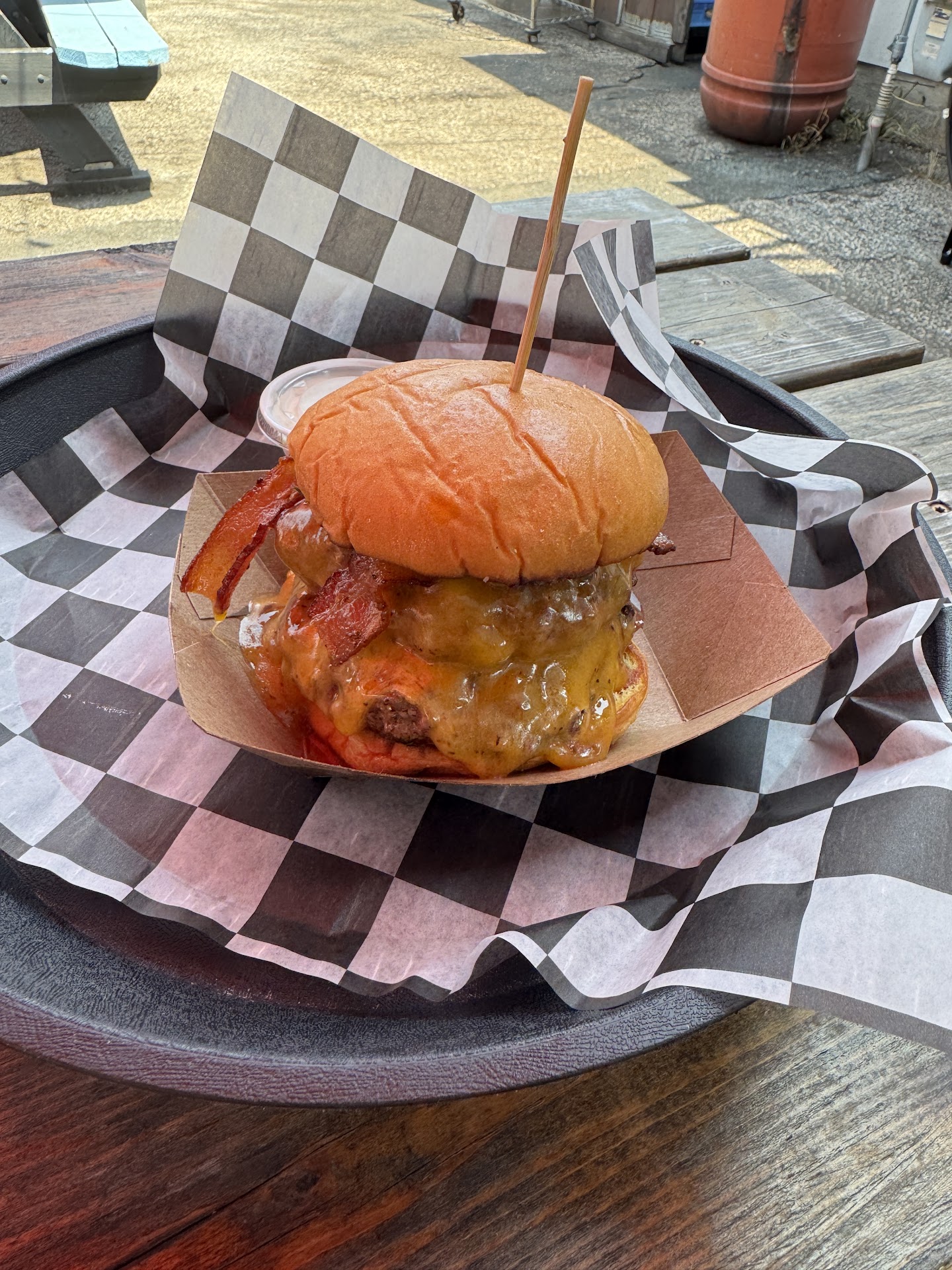 If there were any negatives, my one tiny quibble was that during our entire visit nobody from the staff came by to clear the fourth picnic table that had some leftover food on it when we got there and it was still there when we left. Someone did go by the trash bins to scoop up the trays on which your food is served, but no member of staff ever looked at or walked into the actual outdoor dining area to see if anything needed removing or...