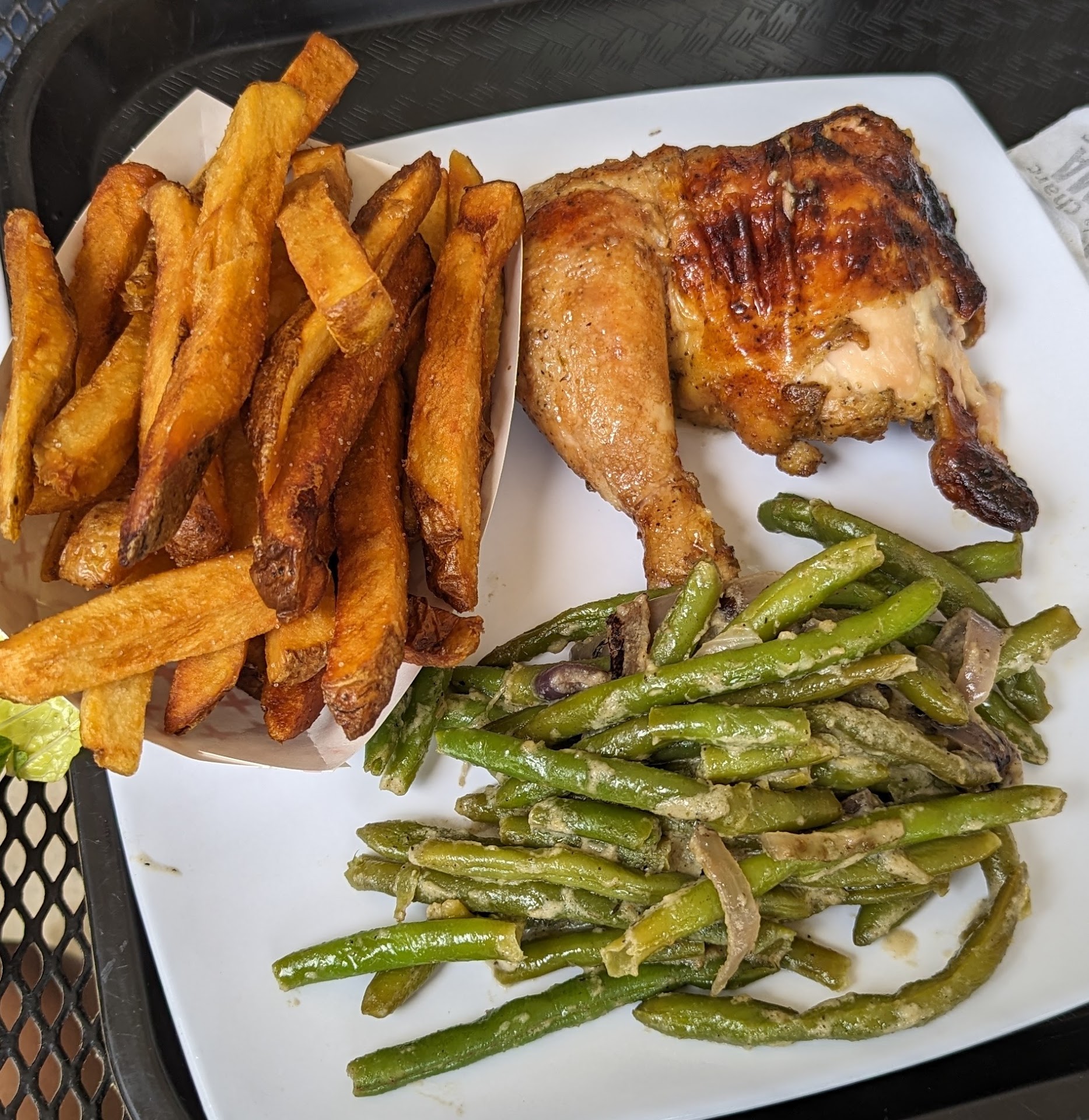 I recommend 1/4 chicken for 1 meal's worth, though next time might spring for 1/2 since they give so much quantity in sides. Their chicken is so tender and flavorful. I thought I didn't like peruvian chicken until I had it here. For sides, I recommend rice+beans and the green beans. I have tried the fries as well and they were extremely mid, teetering on bad and flavorless. Don't recommend those at all.