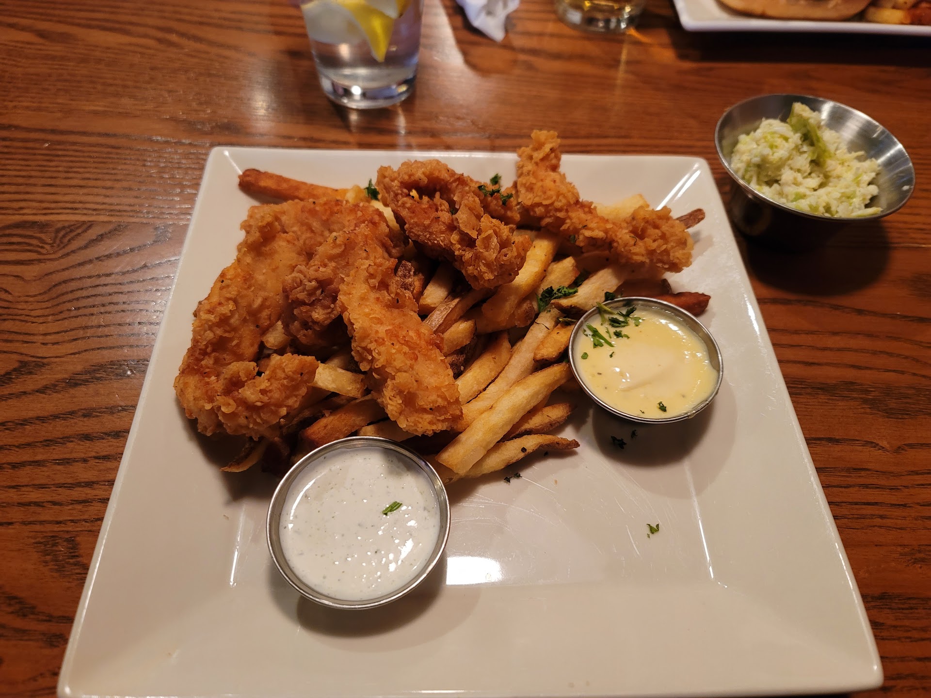 Food, Chicken strip breading was excellent and fried perfectly. Great crunch and bursting with flavor. Not too oily either but retaining the flavor from the oil. The chicken itself was sub-par and left me looking for more. The chicken did not deserve to be inside that breading. The 'local' burger with the works is always excellent. Supports local farms and farmers. The fries were alright. Also breaded very well but on the thin side for half of mine. One of the orders had fries seasoned heavier than the other which left us confused.