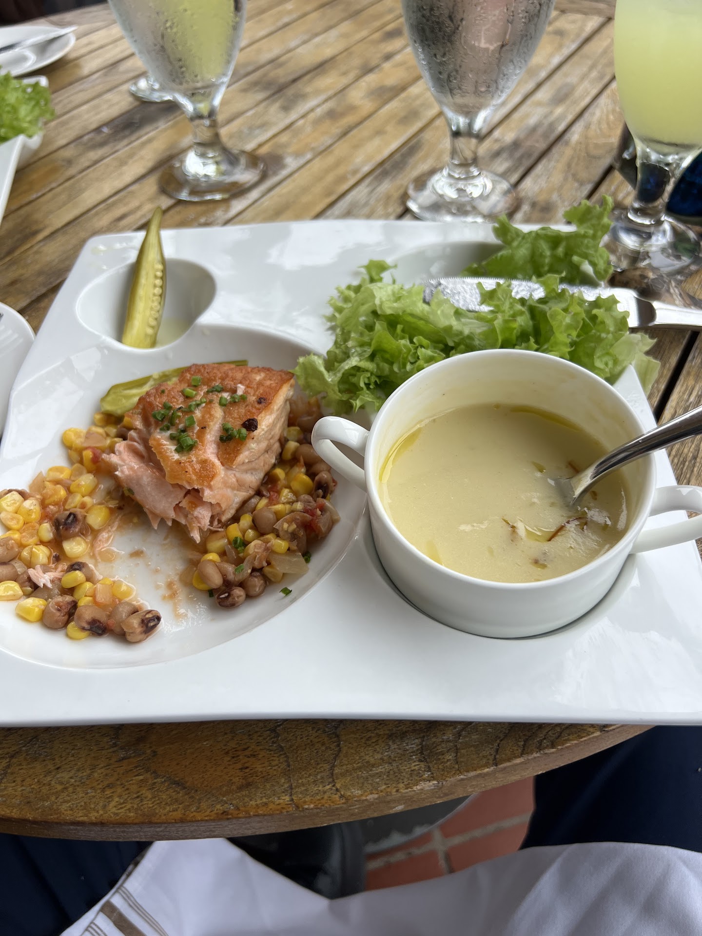 Read moreCarolina Inn – Saturday at noon. (The one day of the week they do not have a buffet.) My partner and I invited guests to lunch and wound up too embarrassed to talk about the food. I had Sautéed Sunburst Trout, Sunchoke Puree, Dandelion Greens, Sunflower Seed Vinaigrette. Since I attempt to eat heart healthy, I avoid fried foods and asked for it to be broiled, which they agreed to. When it arrived, the meager portion had had all flavor cooked out of it, been soaked in some yellow salty solution, possibly butter, and served over a dainty portion of dandelion greens. Everything was way too salty for my taste buds. The ½ teaspoon of Sunchoke Puree, forgettable. Didn’t see a single sunflower seed, but maybe it was pureed too. My companion ordered the Confit Chicken Salad, which she assumed was to be fresh chicken, and healthy. It turned out to be limp shredded chicken of somewhat slimy texture, with seemingly micro-waved cheese, on tomato slices. Our guests, who treated us to lunch, since we picked out the restaurant, had the Crispy Chicken and Half Sandwich and Soup. This was the first time I had ever been with another couple and no one talked about the food. No one offered to share. In retrospect, they probably were being polite and not complaining because we had chosen the venue. My partner and I, in turn, would not complain because we felt it would embarrass our host. Lastly, the service matched the food. We sat there, with three empty plates and one picked at, for over ten minutes. Only when the waiter came over to ask if we wanted coffee, did we have the chance to ask to have the table cleared. The restaurant was not very busy. Things like cleaning empty dishes and refreshing empty water glasses could have been done without asking. One star, since they did have our table ready...
