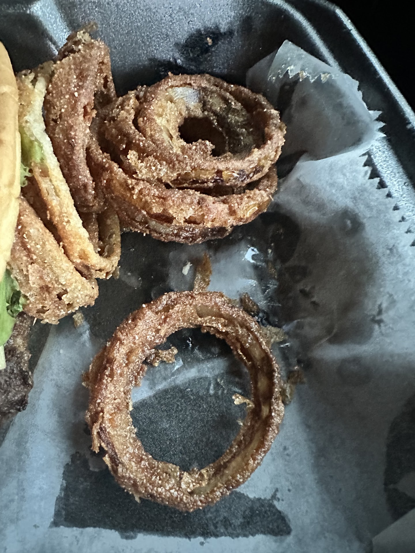 We ate here tonight as this is usually my husbands favorite spot to eat but the past couple of times we’ve ate supper here it hasn’t been the best but we gave it a shot and sadly half of our order was burnt. We got 3 chicken nugget meals and the kids couldn’t bite into the chicken because it was so overly cooked, we got fried pickles and there were no pickles in the batter, they had been fried away Im assuming. My husband got a burger with onion rings and they were also burnt. I took a picture of the onion rings but forgot to get pics of everything else before I took it back inside to change it. We switched the kids meals to burgers and they recooked the pickles and they look a lot better.