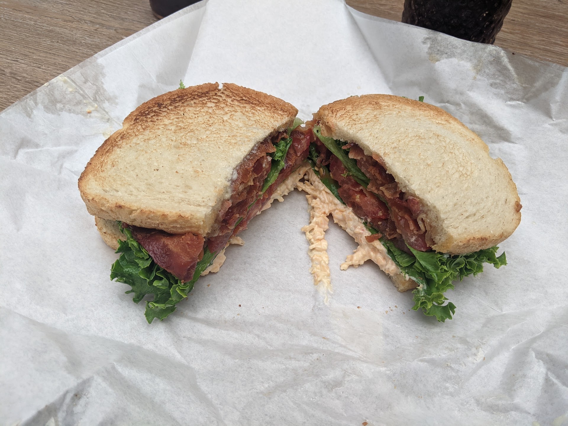 I dislike blt's with a passion but this place is a magnificent exception! Most places I see a BLT on the menu and don't pay it any mind. I love not just the flavor of meats on a sandwich but I like it to be the diva on my sandwich and not just Kevin Federline along with the lettuce and tomato. Merritt's is the only place I have ever seen that puts so much bacon on a BLT that there's no mistaking it for simply being a lettuce and tomato sandwich with a strip or two of something that could possibly pass for bacon if I disassemble the disappointing poor thing. A friend had chosen this place for lunch and when we pulled up to a full house I said to myself, great a hipster place...again. I thought I was in store for kale sandwiches and hummus but it couldn't be further from the truth. We walked in the door and were completely lost. There were 2 lines. Where do we order?!! Apparently an employee going on break saw us on her way out and told us to order on the left, pay at the front, then pick up our food on the right side of the left line. She was super nice and we did appreciate the help. I hate walking in somewhere and being overwhelmed with a sense of being lost and confused. Now let's get back to this God almighty BLT. So originally I had no idea what I would be ordering, then I saw a gentleman walking back to his table with a behemoth of a sandwich chocked full of bacon! I say "I gotta get me one of those!" Upon inspecting the menu, that is their signature sandwich, they had a single, double, and triple BLT. So you knowing me, yea I ordered the double just to tip a toe in to test the holy waters. My friends ordered the chicken sandwich and the club. We always share so I got to try all 3. The double BLT was generous to my palette and deep within my soul. I had to constantly remind myself to chew rather than inhale the masterpiece. The perfect blend of salty sweet meats with lettuce and tomatoes complementing each bite. Truly they were nice ripe slices of tomato and crisp lettuce but never stole the show from good ole bacon. I loved that bacon so much...until we met again. Now the quarter of chicken salad sandwich and quarter of the club from my friends were both really great. I enjoyed both samplers. Merritt's is no one trick pony. Every consumable that came into contact with my mouth was quite delectable and I will never forget that day. I will...