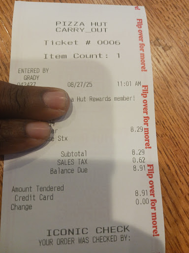 Read moreI not really the “reviewing” type but this one is absolutely necessary. I placed and order yesterday for 10 pizzas at Domino’s (the one adjacent from this Pizza Hut) and they were scheduled for pickup at 10:30am this morning. They called me at 10:35 while on my way up there for pick up to let me know that no one showed up for work and my order wasn’t going to be ready until hours later. I had have these pizzas for for an event at 11am and it wasn’t looking like that was going to happen. By chance I called Pizza Hut and was fortunate enough to get in contact with Leah who answered the phone. I explained my situation and she told me to come pick the 10 pizzas up in 20 min. I got there in 15 and not only were the pizzas ready but she provided us with plates and napkins for our event and even helped carry it all to my truck. She went above and beyond to help us and the entire staff was both helpful and friendly. We will forever be loyal Pizza Hut customers after this and highly recommend this specific location! On top of the amazing service the pizzas were perfectly prepared and we made it just in time for our event. Thanks again Leah and the team...