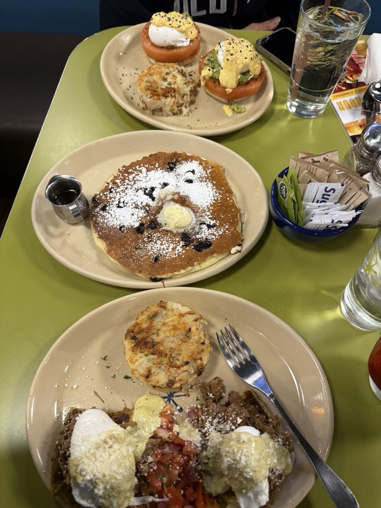 I ordered the Barbacoa Chile Verde Benny & my girl ordered the Smashed Avocado Benny & we got a blueberry pancake for us to share. Orders arrived in about 12 min., which is relatively fast considering Snooze's busy brunch time.