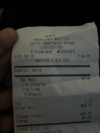 Ā Ā Ā Read moreTonight was the last time I came to KFC in Charles Town. We placed an online order to be picked up at 8:50. I showed up to one of the entrances locked so I assumed they were closing, but I was due to pick up an already paid orderā¦so I went through the order speaker to check. I was told to wait in the front and that theyād bring my food out. Everything was fine until I got home to find my order was incomplete.