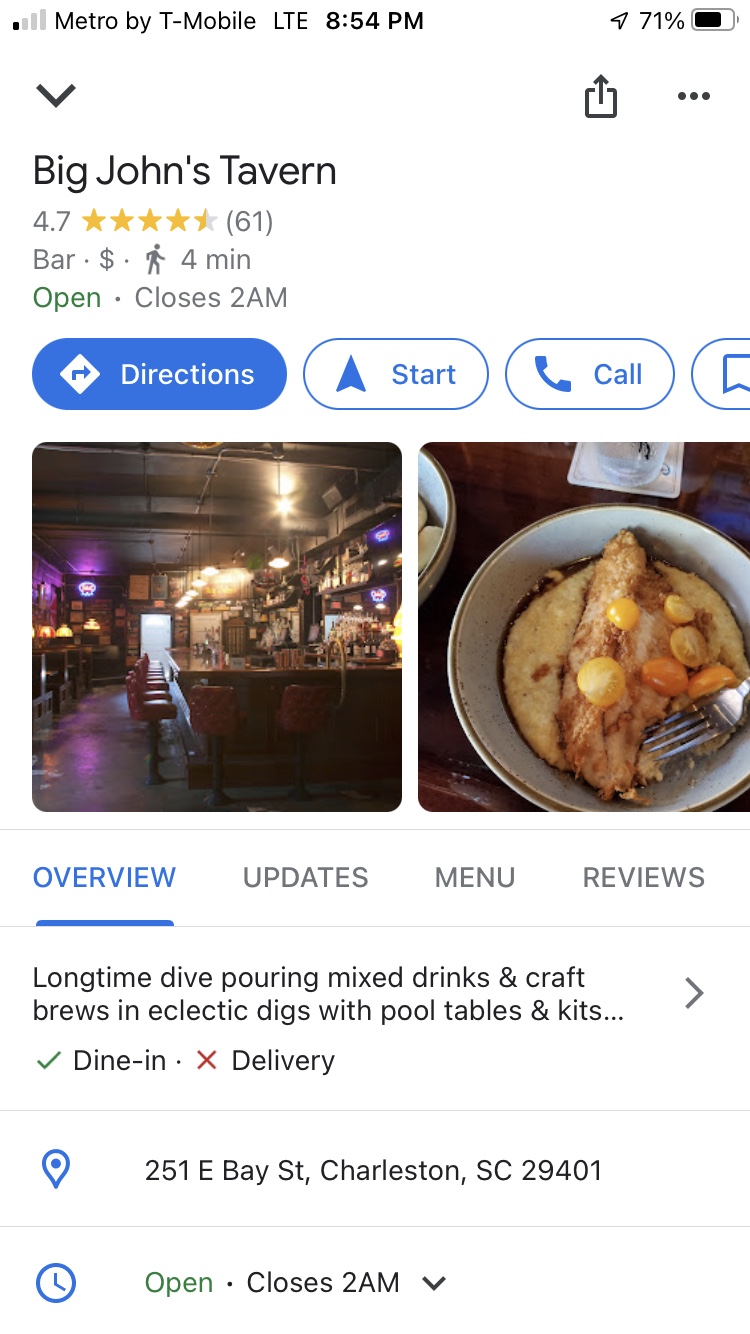 while we are no longer spring chickens, we had the absolute best time at big John’s tavern. The food was fantastic the libations were a great value, the wait staff and bartenders were friendly and efficient. I must admit we stayed longer than I had intended. The chef owner of big John’s, park his motorcycle at the front door, if it were a more “manly “motorcycle, that might be a good idea but given its appearance perhaps you should hide it around back. When you go there you will see what I mean If I lived in Charleston this would be...