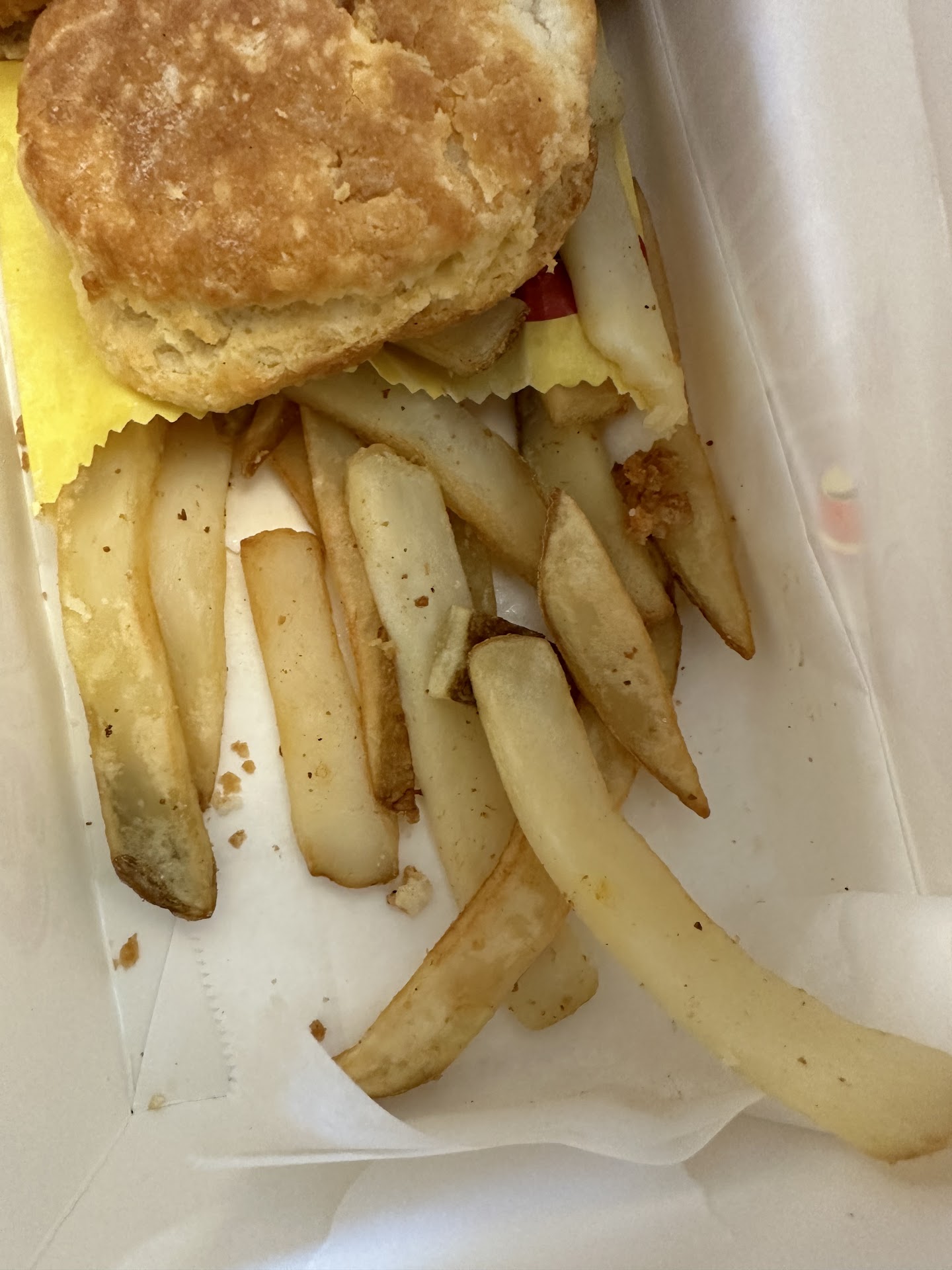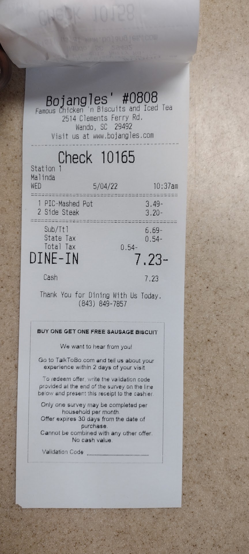 This was all I had to eat the entire day and was at evening time. After eating, I started to feel pain in my stomach. Some hours later I couldnât leave the bathroom because of the diarrhea which lasted for about an hour, accompanied with nausea for several hours which I took medicine to help subside. It has now been 12 hours since eating and Iâm still experiencing pain and discomfort. I never get sick, and never have pain or discomfort. Yesterday evening I had a chicken sandwich from Chick-fil-A and felt fine. So i do not believe that has anything to do with whatâs going on today. Iâm really convinced that this meal today from Bojangles is the only thing that could have caused what Iâm experiencing right now. Iâve ordered a biscuit there two different mornings last week and both times the biscuit was drenched in I guess butter. The bottom half was yellow, literally looked soaked like the bread was a sponge. It was difficult to eat so I sat most of it aside. Oh, and I went to their drive thru last Sunday 2 hours before google says their close time is... the lights were still on, and so I sat there for 5-10 minutes, then I pulled up to the window for another 5 minutes, didnât see anyone in there, and I left. If Sunday hours are different than what google lists please update it.