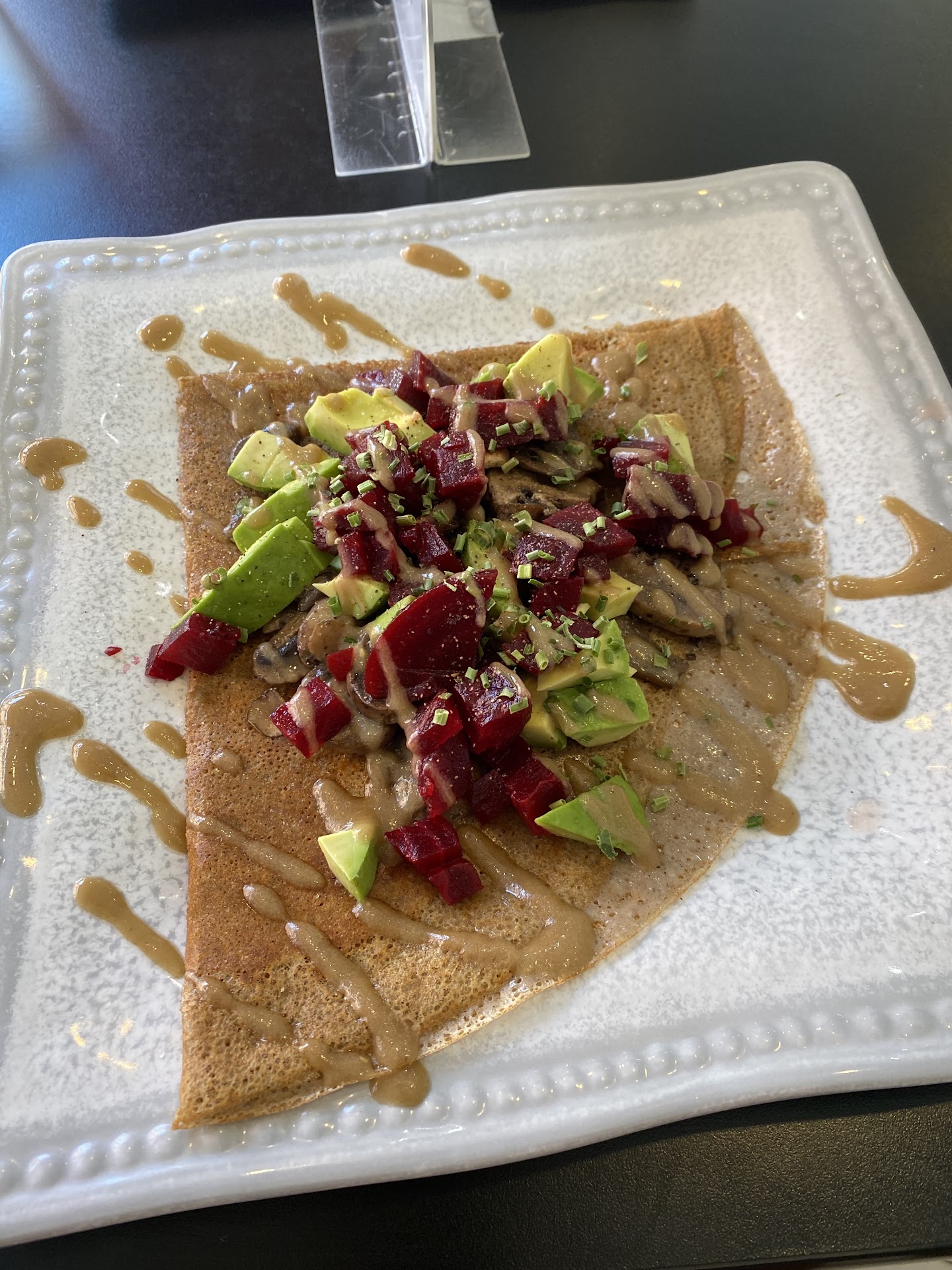 Read moremy crepe was good( savour de monde in my pleasant is much better), although I didn't appreciate the service at all. They wouldn't accommodate any request, such as swapping one sauce out for another... Seems simple enough or even when I offered to pay more to add avocado, a common restaurant practice, they refused. Very bizarre! In addition, although I tipped more than I should have ahead of time at the register we were never checked on, our Waters were never refilled we were never asked if we liked the food...in short no service was provided. the other two crepes ordered didn't look good at all... Perhaps they just picked the wrong things on the menu but their scrambled eggs looked like basic cafeteria style, nothing I would order and my husband's crepes with cinnamon apples was dry with no sauce and extremely simplistic he did not enjoy it. Another crepe was served in a cup with fruit, also seems like nothing special... Especially since the fruit appeared to not be fresh, even the bananas...