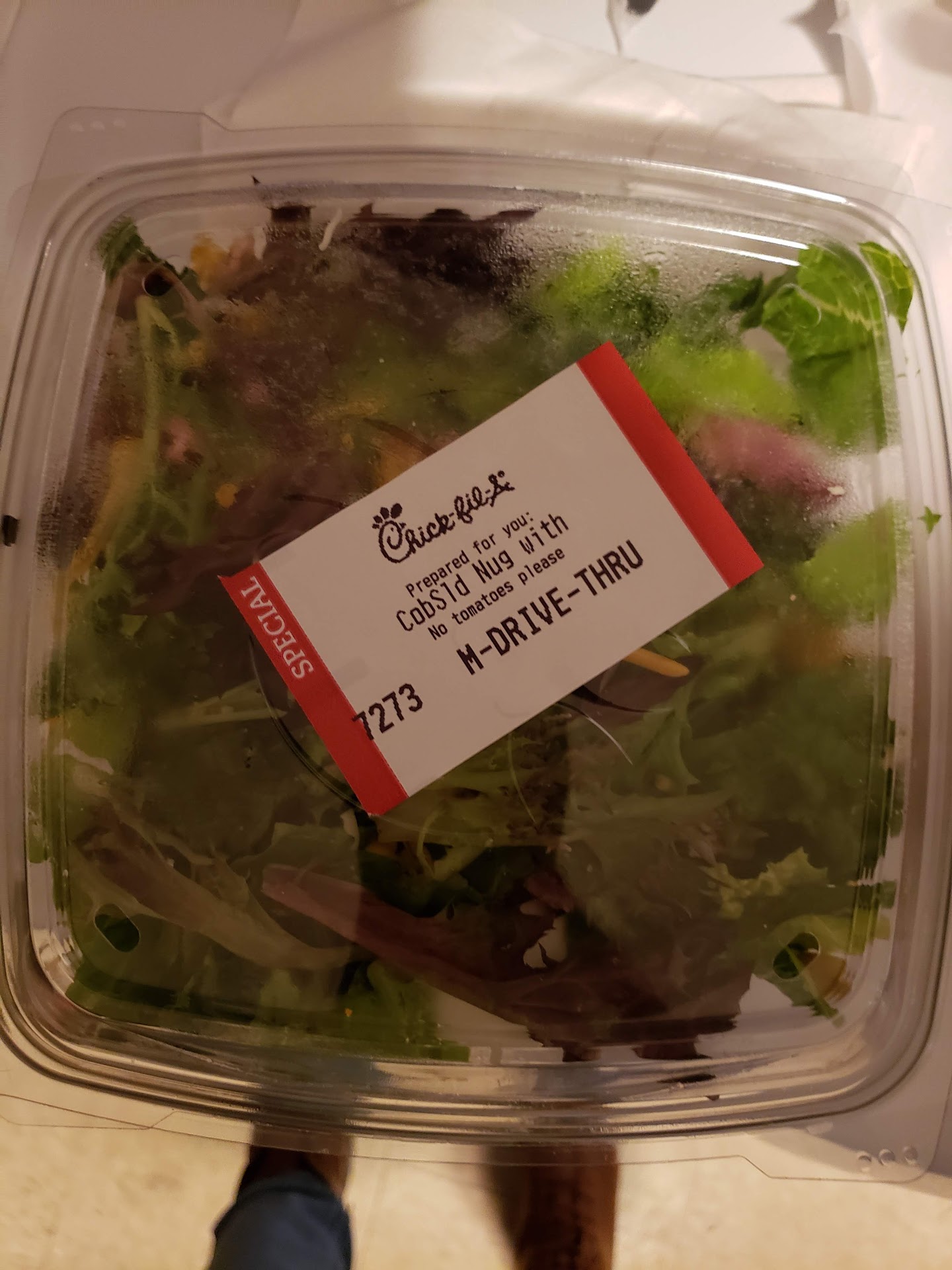 Here goes! A few days ago I placed a catering order for my husband’s birthday- a nugget tray and a gallon of sweet tea, nothing too complicated. Today is the pickup day, so I get to this particular Chick-fil-A and pull up to the mobile order line since I placed the order through the app. I asked if I could still go through the mobile order line even though it’s a catering order because I was by myself with my sleeping 2 month old son. They radioed inside and were told I had to park and come in. I then asked if I could just park and someone could run it out to me since I prepaid and really didn’t want to wake up my sleeping son. I was again told I HAD to come inside to get it.
