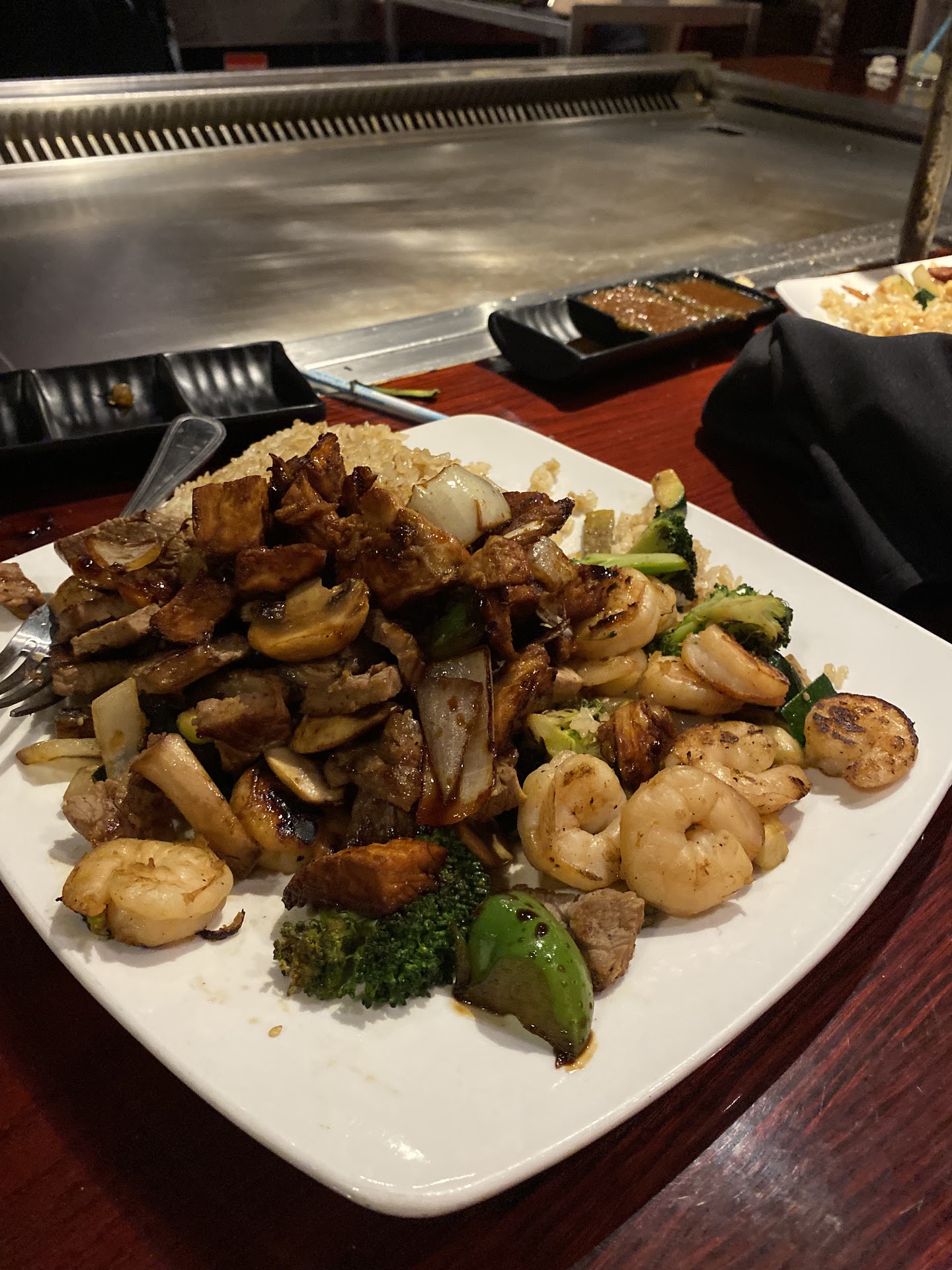 Food…. 90 percent fried rice, only onion no other veggies or egg. Steak, chicken and shrimp were cooked very well and were tasty. Vegetables only consisted of onion and zucchini (very small serving)