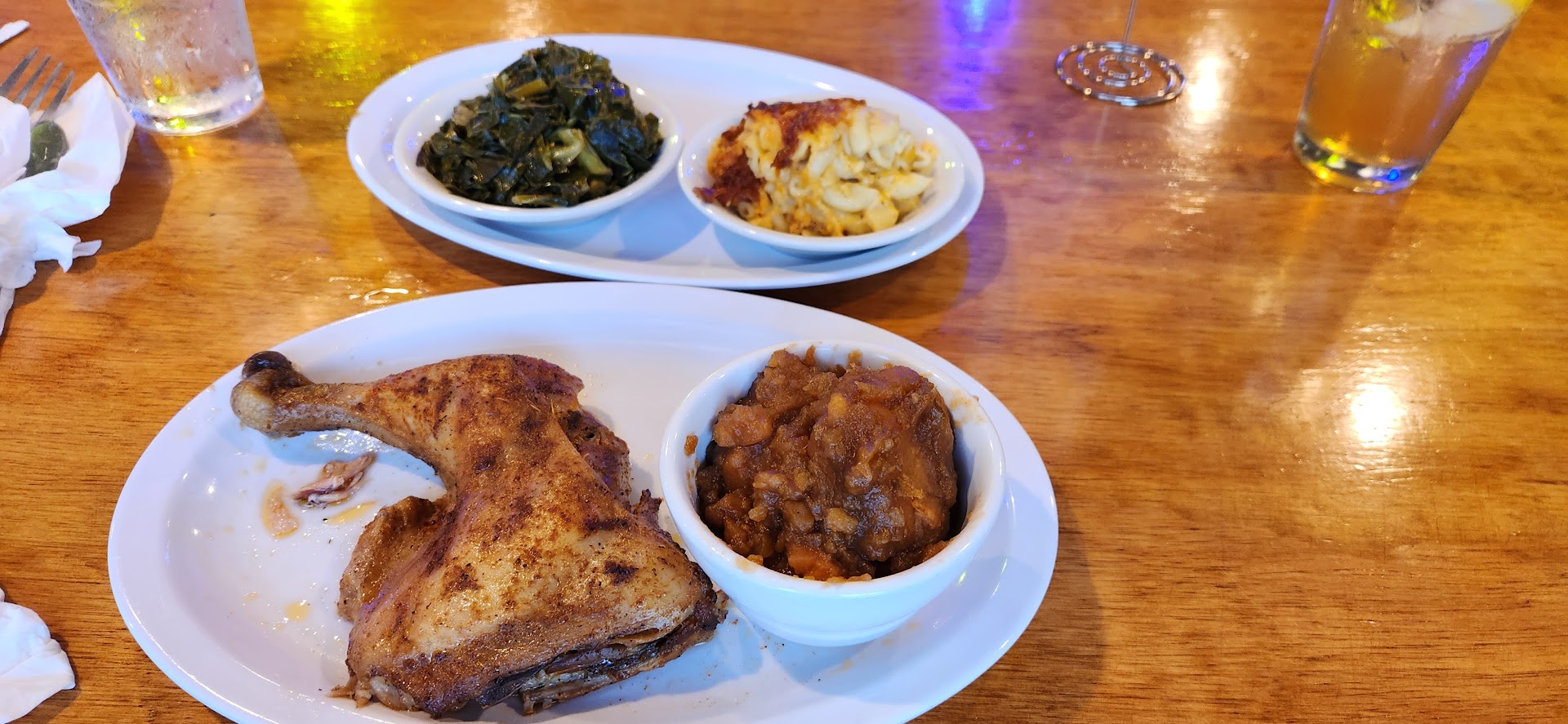 FOOD: Hands down the food was excellent. Trying to be somewhat healthy I had the baked chicken quarter, a side of mac and cheese, sweet potato and collards. Can't have collards without cornbread. The portions were perfect for me! I had enough to take half of it home. The food came very hot and the person that brought the food out was extremely nice (different from our waitress) and funny.