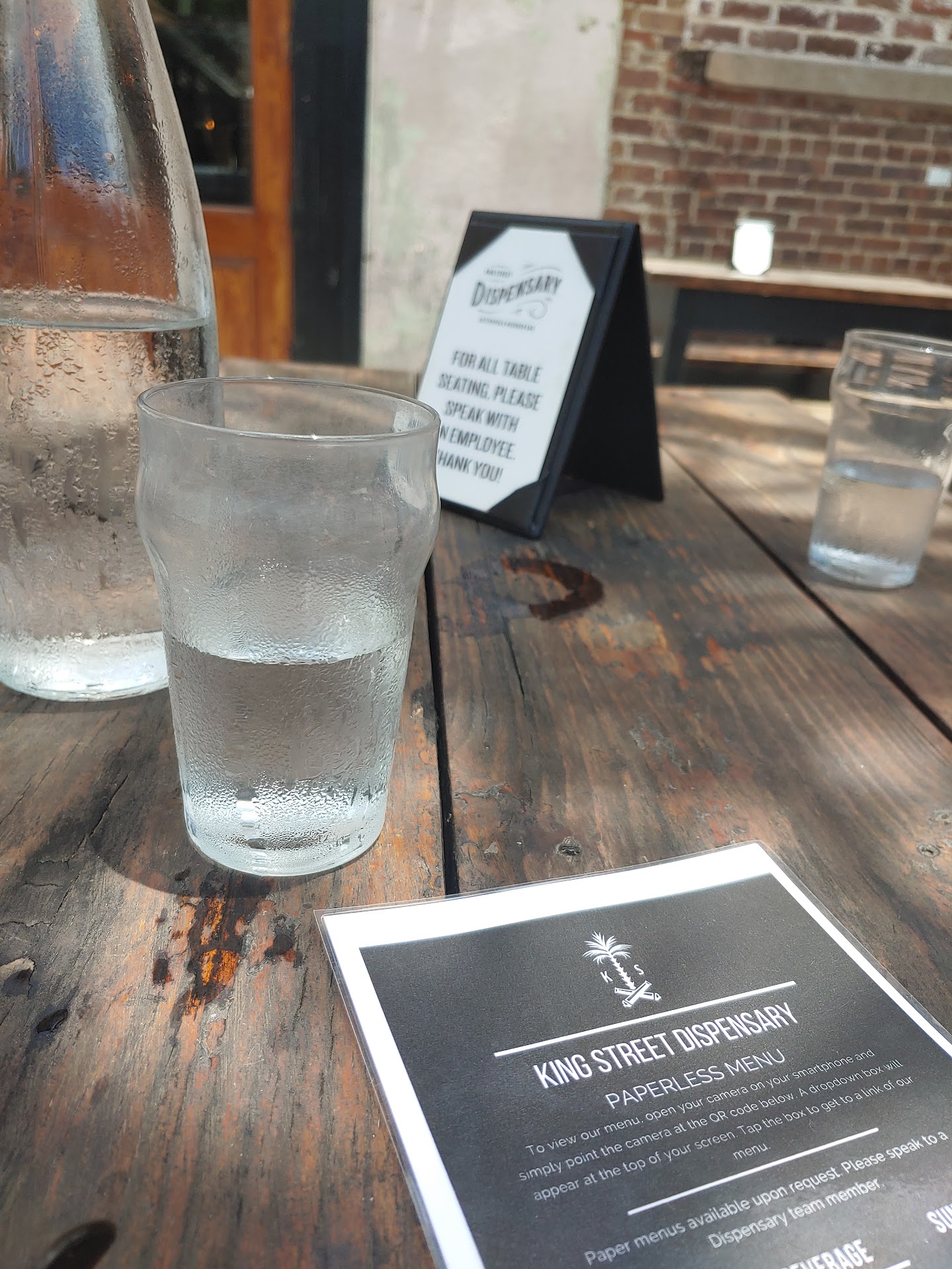 After 15 minutes of waiting on the patio in the hot sun, this thing of water was the only thing we experienced. The hostess, aka waitress, said I will be right back, didn't ask if we wanted a beer before poofing.....10 minutes later a waitress came out, chatted with a table of 8 young guys, asking if they needed drinks, conversed for another 5 minutes about where they drank last night, should go that evening, etc....looked at us and walked back inside as I was trying to flag her down. 2 or 3 minutes later, we got up to leave, walked thru the bar area, where 4 employees were conjugated at the end of the bar talking and playing with their phones....i looked at the HOSTESS/waitress and told her 15 minutes was my max with water only......she looked SHOCKED.