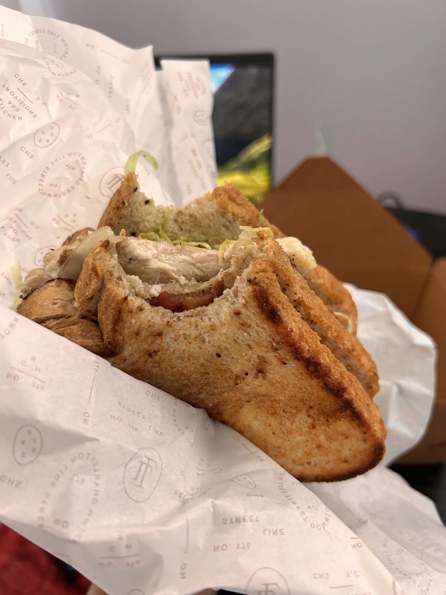 I got the chicken and biscuit which also comes with 2 sunny side up eggs and I added the cheddar grits based on the servers recommendation. My husband had the BLT which has a fried egg on it as well. Everything was just delicious! The chicken came with a hot honey for dipping that was just right, the biscuits are incredibly light and fluffy and she wasn't joking about the grits - they were the best I've ever had. You know how grits are basically a flavor vacuum? Well, I don't know what they do here, but these are absolutely delicious.
