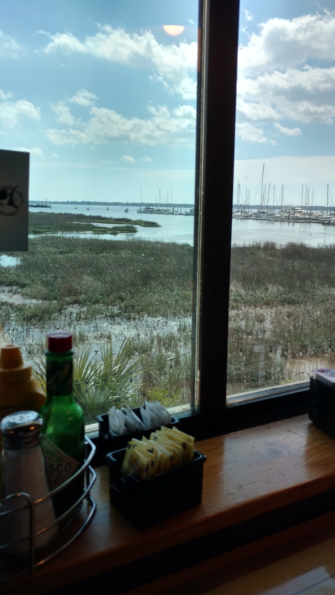 So, the parking will be validated so bring your ticket. We walked in at 3 on a Saturday (an hour before the kitchen swaps to dinner only) and were greeted by.... we weren't. There were three servers counting their cash and cutting up with each other talking about the money they made and two hostesses behind the counter. ALL 5 said nothing for a good few mins. Then one girl finally asked and led us to a table. The ceiling tile is warped and falling, the outside of the restaurant is rusted, but it's natural since they have salty water around. Our table had a view 8 out of 10 of the Marina. Just beautiful. Then our server, an older woman with blonde hair and a raspy voice greeted us. We didn't know what to get and she stopped by about every 3 mins asking if we were ready (not offering help, as she was more preoccupied playing around with employees) after already approaching us initially with an irritated attitude. My wife asked, "How is your clam chowder?" And the lady looked at her and just shrugged her shoulders and said, "Well, it's a cream based chowder. Soooooo." I wanted to say, "WHAT IS IT?! CAMPBELLS?!?!" That was the service we were getting. Nothing answered, irritated employee. Anyway, I got the veggie wrap and my wife for the pan seared oysters with the beans, collards, and fries. About 10 mins or so later, the lady approaches with the food. The veggie wrap (mostly full of lettuce, but okay) and her "pan seared" oysters were just battered for the fryer and put in a pan. Not really seared... should have just gotten them grilled. Asked the server if they were fried or pan seared because they looked fried and the server just looked and said ,"Pan seared", and walked off in a huff. No exaggeration. (I was a 5 star server for 7 years so I accept sub par service. I understand it. But terrible service I have no patience for) The sides and food were fine... just fine.... the "pan seared" oysters were slimy and covered in a ton of batter, the wrap had mostly lettuce and very little other vegetables, and the service was terrible. Maybe you'll have a different experience, but...