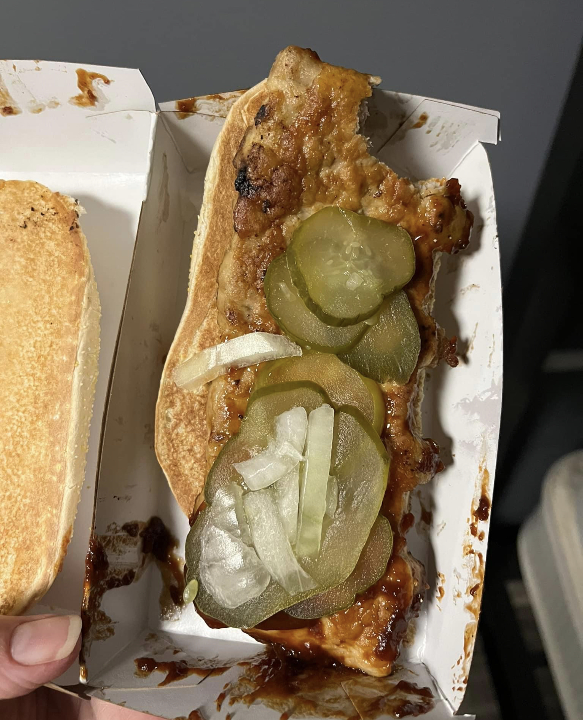 The nuggets were good with sw&sr dip, the fries were good having been pulled from the lard within the last 3 to 5 minutes however the container was far from correctly filled and was at least 25% low. The QP patty, cheese and condiments were fresh and proper on a warm but old bun. You know pretzelly chewy texture at the edges so it was a c minus overall.