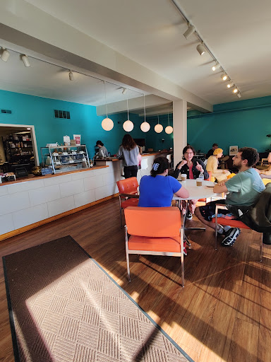 This is a small but inviting spot to enjoy your morning coffee. The space includes a handful of tables and a bar seating area that runs along the counter. Thereâs a cool, modern vibe with light wood finishes and a splash of teal on the walls. Soft music plays in the background, adding to the relaxing mood. The large front windows let in lots of natural light, making it a pleasant place to sit for a bitâwhether youâre meeting a friend or flying solo. Outside, the umbrella-covered sidewalk tables give off a relaxed, urban cafĂ© feel.