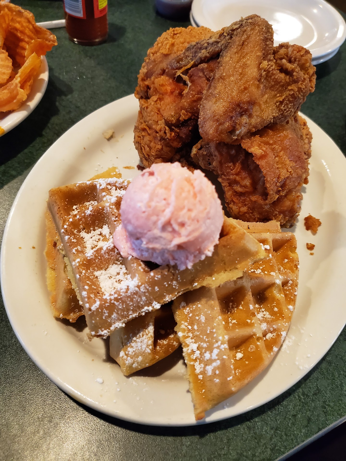 The hostess, kitchen, and service staff were all friendly. Curtis was our server and he was knowledgeable and professional. The atmosphere was a great mix of retro dinner and contemporary decor. The menu was impressive. Shared the homemade chips with friends. They are cut like ruffles and had an excellent crunch. We didn't get one soggy weird chip among the plate, which is not usually the case with chips made in house. The star of the meal was the chicken and waffles. I gotta tell you two things about fried chicken and my perspective - I don't usually order or prefer bone in chicken and I strongly prefer spicy. This chicken was bone in and not spicy, but it was the most delicious crispy crunchy fried chicken I've ever had. Those waffles with the strawberry butter were just immaculate. Fluffy waffle pillows on which rest a scoop of the enticing pink strawberry butter. This was absolutely amazing, two of the 3 of us had ordered it, and both of us felt the same way. If you're thinking about eating here, do it. I will be back and it will be soon, because if the shrimp and grits are as good as the chicken and waffles... UPDATE I've been back several times. The shrimp and grits are indeed very good. I always get either them or the chicken and waffles. My friend recommends the pot...