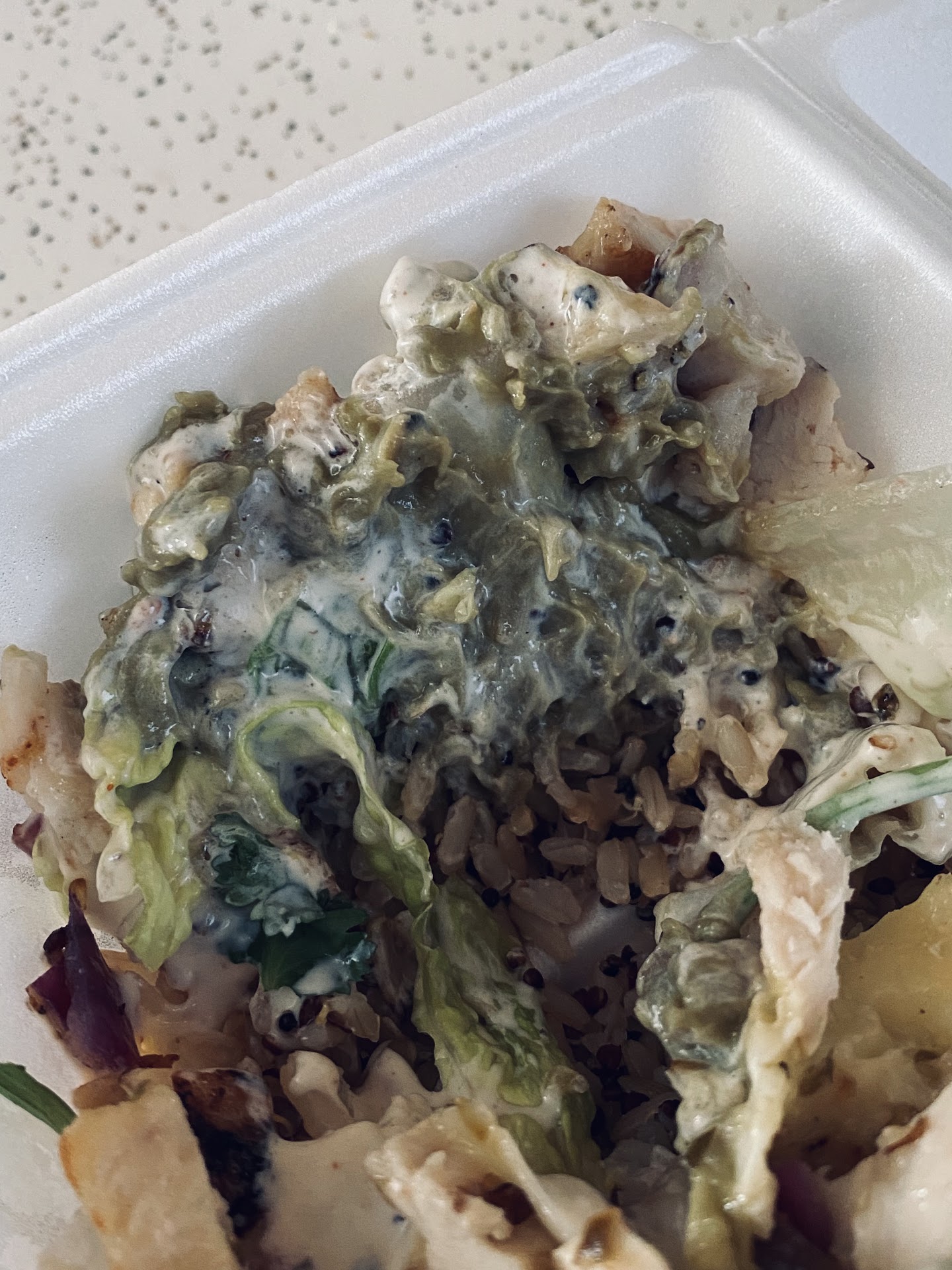 I stopped in today for lunch and hadn’t been in for awhile. I chose to get one of their rice bowls. I had to pay an extra $2 because what I ordered was a signature salad but with rice. I said ok. When I went to the area where I was to tell them what I wanted on it, I just told them to add whatever it came with. The woman sloppily placed old brown guacamole and brown lettuce on the rice bowl. Then proceeded to squeeze a ridiculous amount of dressing on it - not even sure what the dressing was. I said I’m sorry that is way too much and she put her hand in the mixture and pulled out some cheese slices she had put on it. Then added “fresh” cheese slices back to it and topped it off with the chicken that was to go on it. If I hadn’t already paid I would have left without my food.