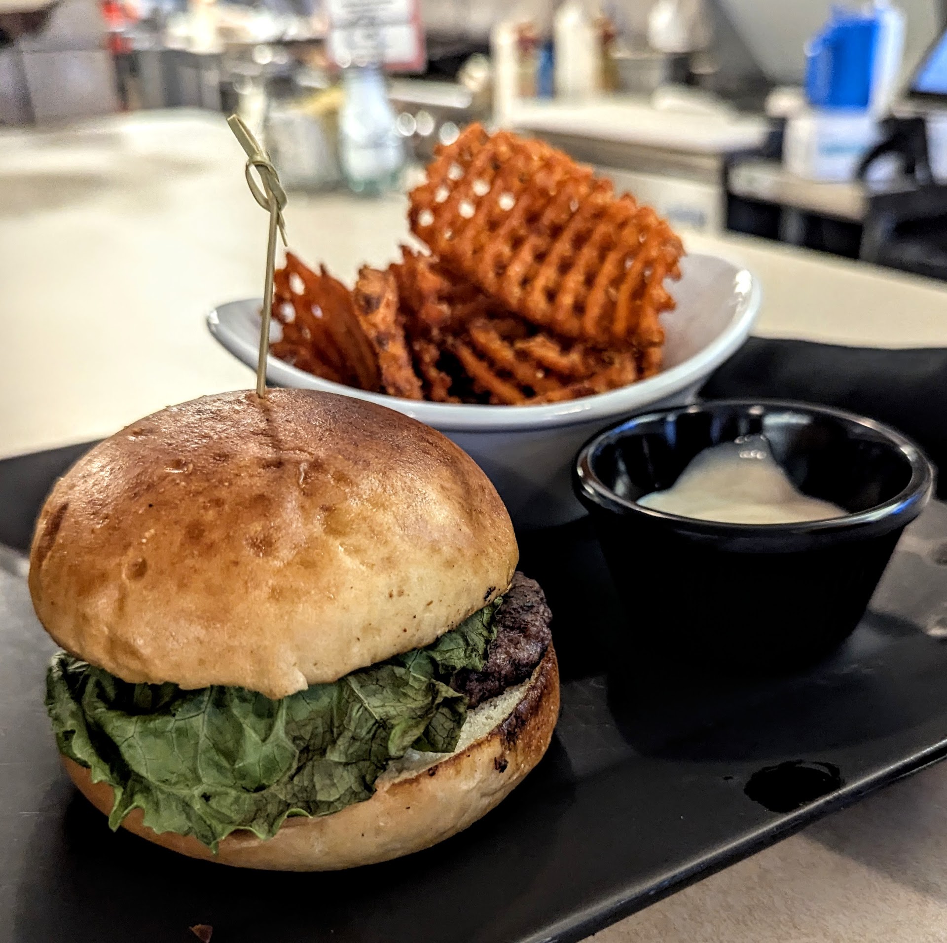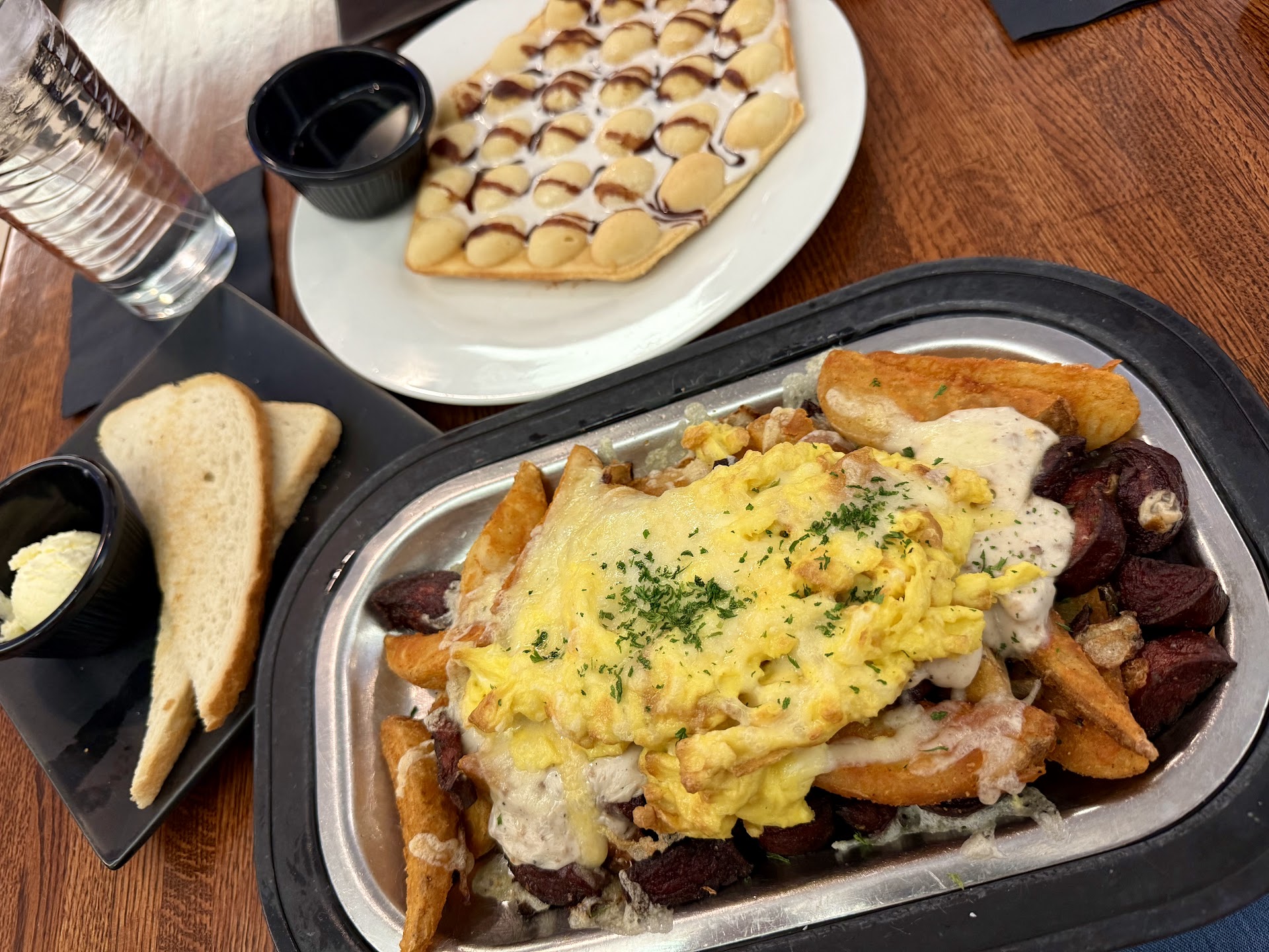 The food that finally arrived was okay but disappointing. My wife had the breakfast burger which was good but was too much bun for the filling. Our friend had a burger which she said the same thing about. I had the bubble waffle with scrabbled egg and sausage. That was the worst fish of the three. Bubble waffles are typically rolled and served as a cone with fillings inside or with the other items on top such as how chicken and waffles are usually served. This one came out with just the waffle on one plate, the eggs and sausage on another and a side of syrup. The waffle was not bad but less fluffy than I expected. The sausage was good but the eggs were overcooked and under seasoned. The worst part of that dish was the bland and unappealing presentation. Just a few pieces of fruit on that plain waffle would have made it much more appetizing.