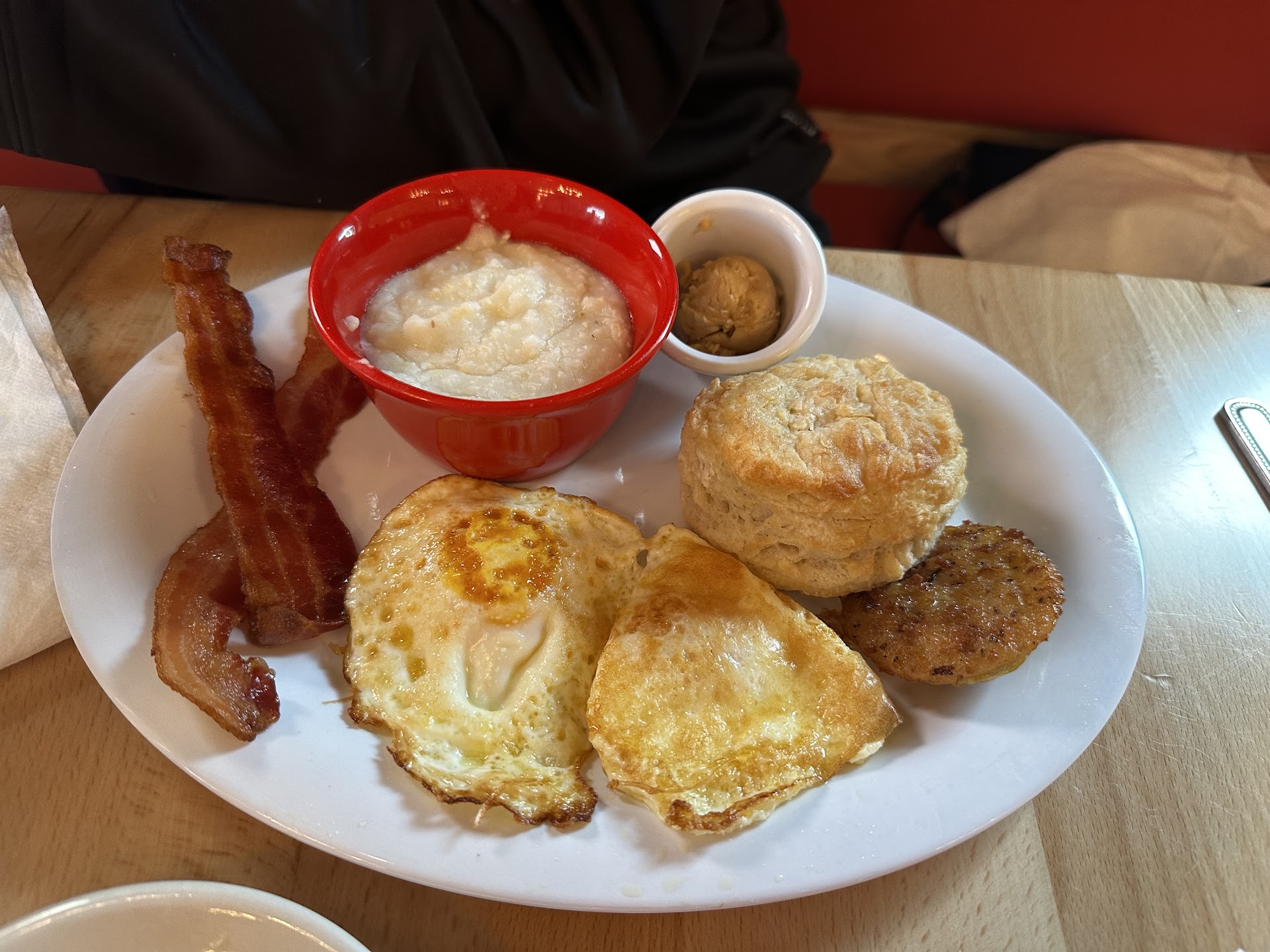 Read moreThis was our family's first visit, and the food did not disappoint. My husband and I ordered each of the benedicts and they were fantastic. My daughter had the cinnamon swirl pancakes and they were delicious, but definitely sweet! My son had pancakes, grits, and bacon. My kids both liked the grits with shredded cheddar, but they definitely needed salt added to them. Our server was hustling, but they were definitely understaffed as stated in other reviews and continues to be a problem at many restaurants in the area. Due to the lack of staff our wait was a bit longer and it took a while for our food to come. There were also a few errors made. We never received our French toast bites that we ordered and were looking forward to trying (they were removed from our bill). After looking closer at the receipt I noticed that we were charged for an extra bowl of grits and a chocolate milk that the waitress brought to our table when our son's first was empty but that we did not ask for which added up to $6.75 in food/drink we didn't have. I didn't ask the waitress to fix the bill because they were so busy and there was a line at the door. Also, I think we would skip ordering chocolate milk there because it is $3.75 a glass...