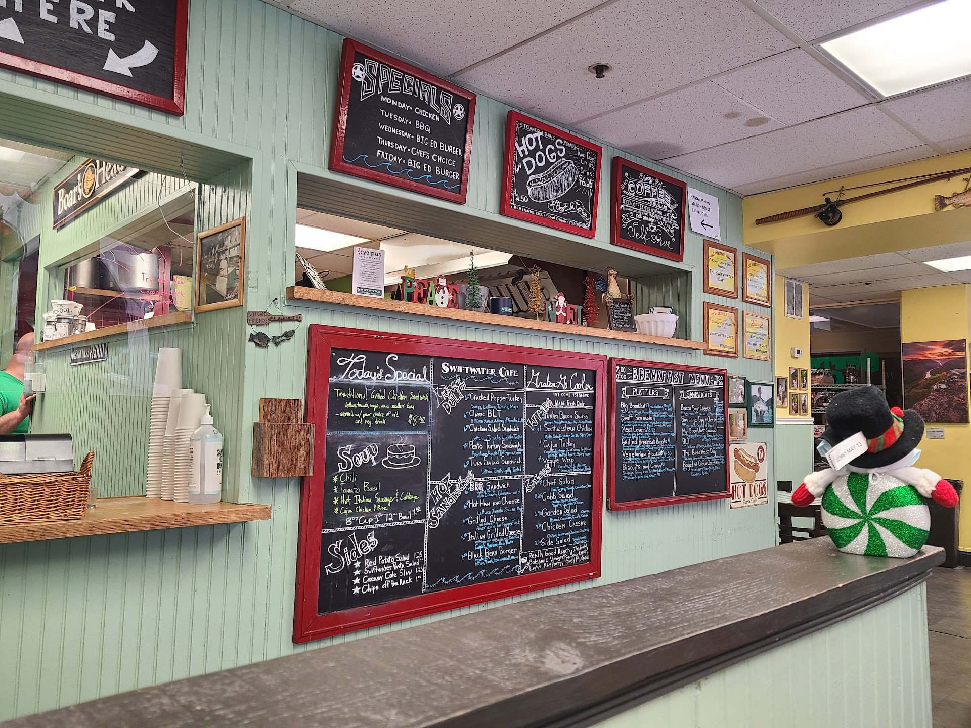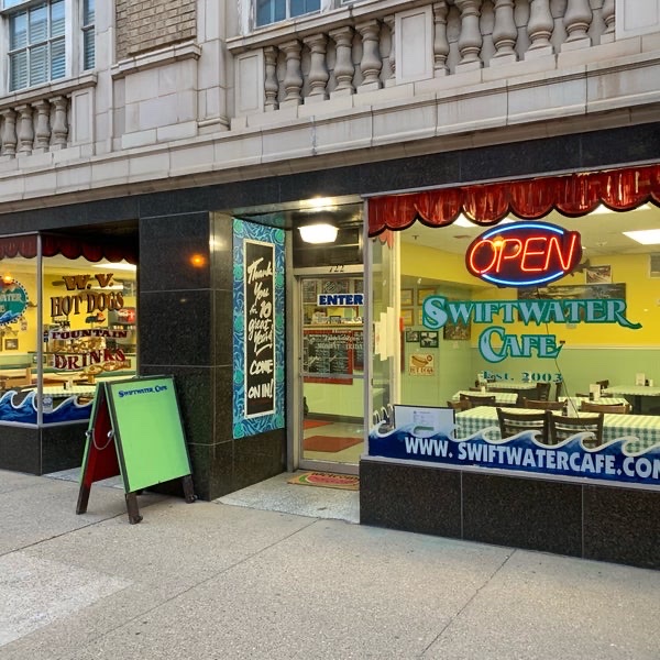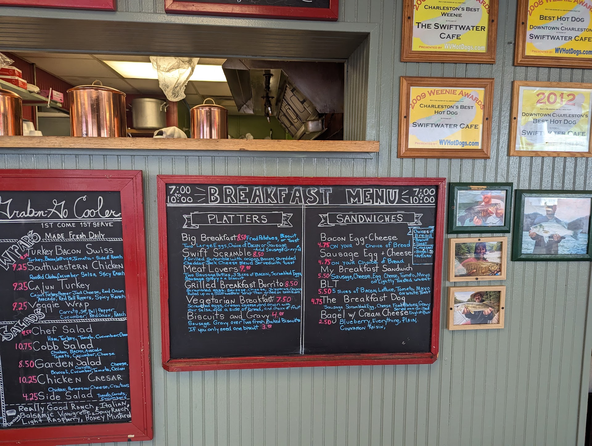 Food is just ok. We were passing through Charelston and looking for local food. Swiftwater came up on a Google search for restaurants near me. I had the BBQ pulled pork sandwich with a side of potato salad. The pulled pork was pretty good, it was served on a plain hamburger bun with coleslaw, but the portion was about the size you would feed a child. A little disappointed. The potato salad was served in a tiny cup. It was basically cut up red potato with some mayo thrown on it. My friend had the grilled ham and cheese. Also served on a plain hamburger bun, but with lettuce and tomato. The flavor was decent but nothing exciting. If your not really exited about a sandwich and just need something to eat, this is a good place. It serves your basic sandwiches, some wraps and typical breakfast items (breakfast served...