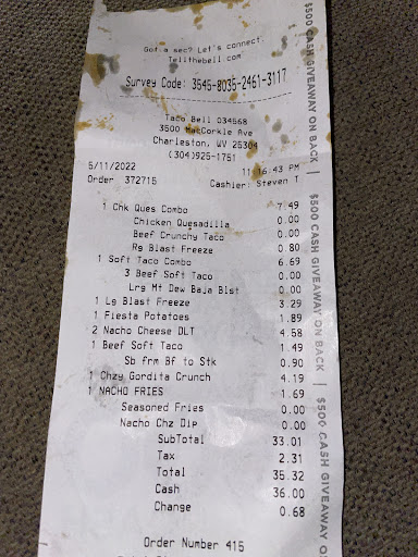 Read moreTaco Bell @ 3500 MacCorkle Ave SE, Charleston, WV 25304. The team member behind the register was high out of his mind. His own team members noticed, all of us in line were talking about it, he was out of his head and could barley stand up. The beverage area was in shambles (couldn't even set your tray down for the filth). The dining area was a mess, people where wiping their own tables down with napkins so they could sit, not even getting into how bad the floor was since this was the only way people could wipe off a table. They were telling us that they were out of trays and would have to bag our meals even though we were eating in. Perhaps if they emptied the over flowing trash cans and cleaned one of the 50 trays stacked on them there would be more trays for use. Not that this is Taco Bells fault there were people bumming money outside that would come in and fill up 1 taco bell small cup and several non-taco bell large cups with soda. I have honestly never seen a taco bell in this...